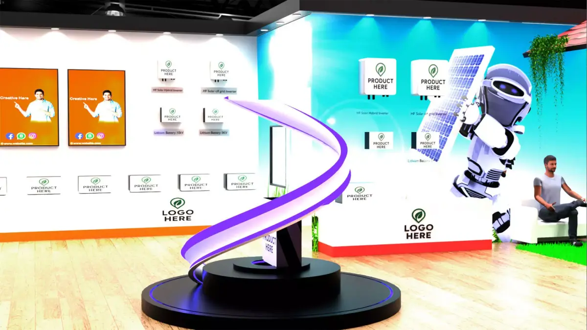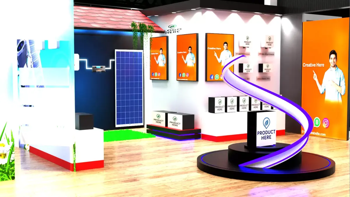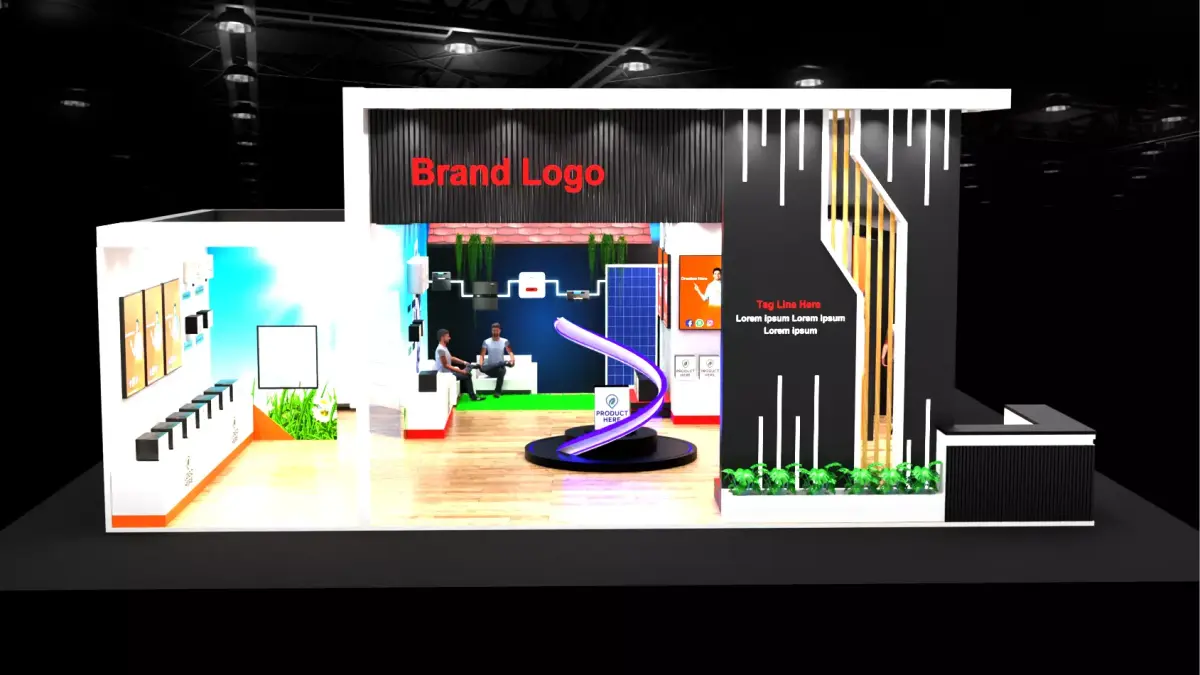 This high-quality 3D model represents a contemporary exhibition booth designed for trade shows, expos, and marketing events. The layout features open yet defined display areas, stylish branding spaces, interactive product showcases, and comfortable seating zones perfect for business meetings. The booth combines sleek architectural lines, premium finishes, and vibrant graphics to attract and engage visitors.