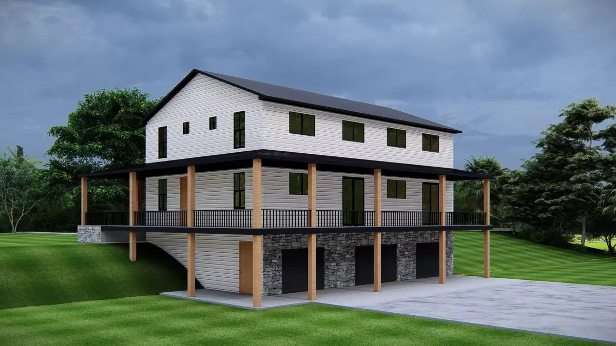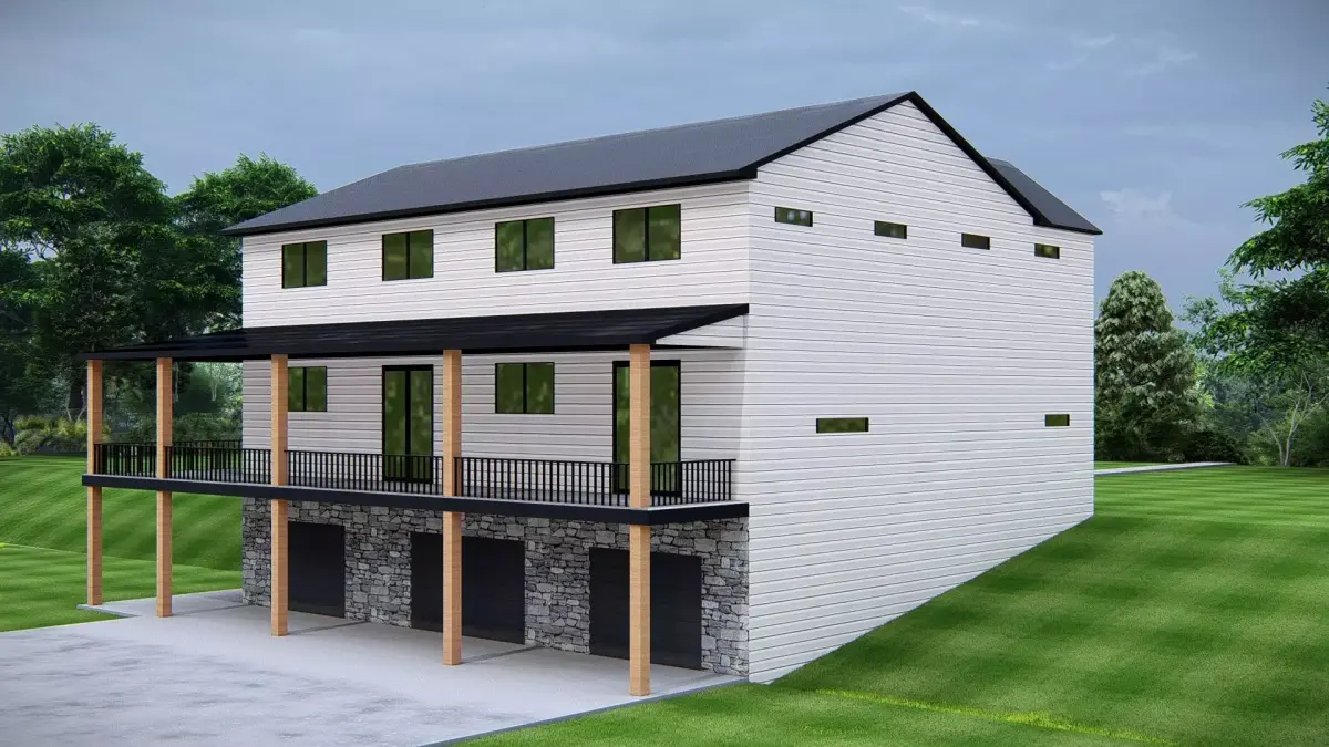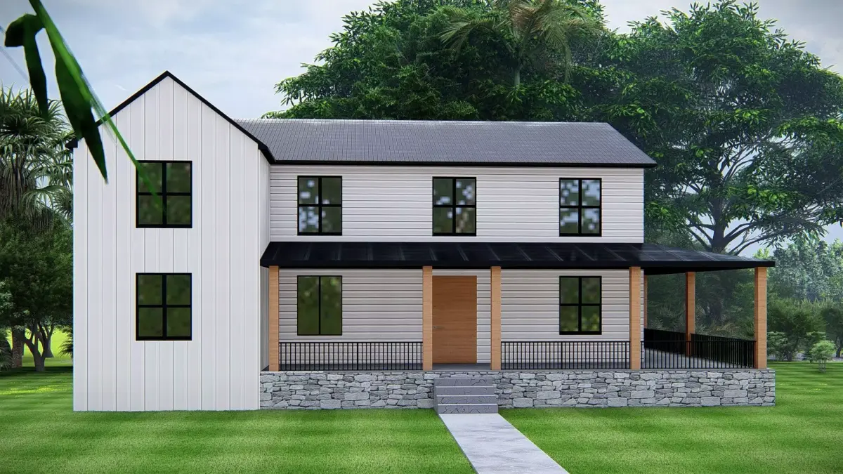 This 3D exterior render showcases a stunning modern farmhouse with a classic pitched roof and elegant black accents. The house features a spacious wraparound porch supported by wooden columns, creating a warm and welcoming look. The clean white siding contrasts beautifully with the dark roof, while the stone foundation adds strength and rustic charm. Large black-framed windows bring in natural light, highlighting the architectural symmetry and elegance of the structure. Surrounded by lush greenery, this farmhouse design blends traditional rural style with a modern aesthetic, making it perfect for residential projects, architectural visualization, and real estate presentations. This high-quality render captures every detail, providing a realistic and inspiring view of modern farmhouse living.