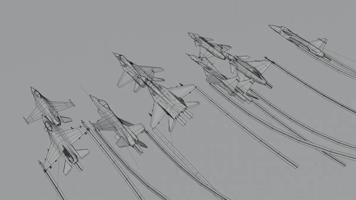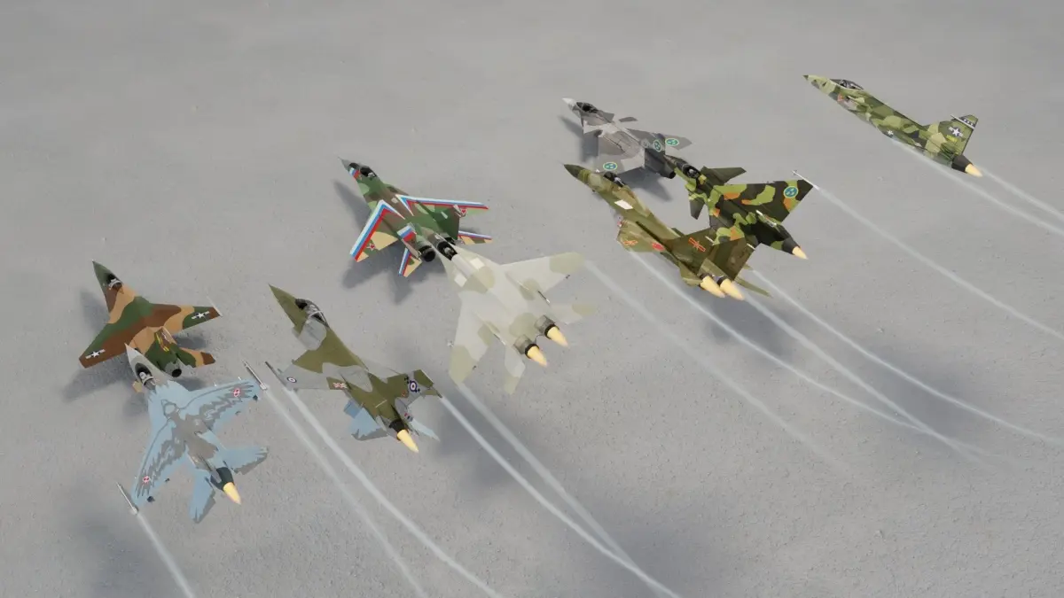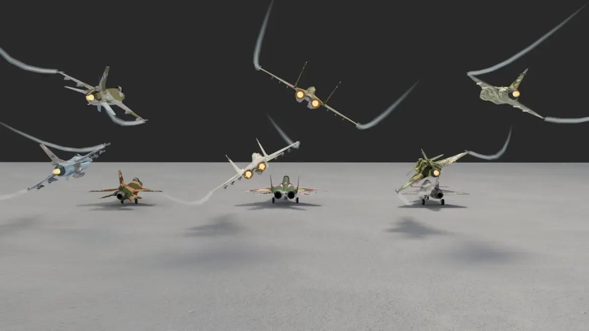 Low poly models of 3 great airfighters of modern era. Each in 3 color scheme, as standing version and flying with armament.
