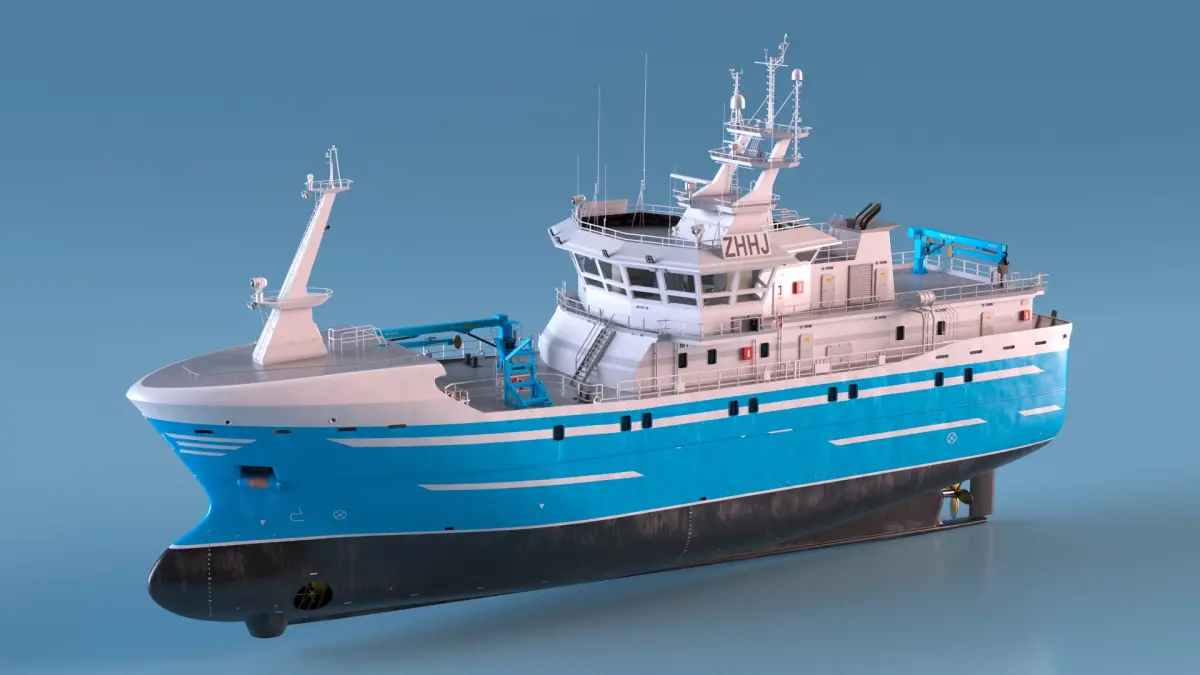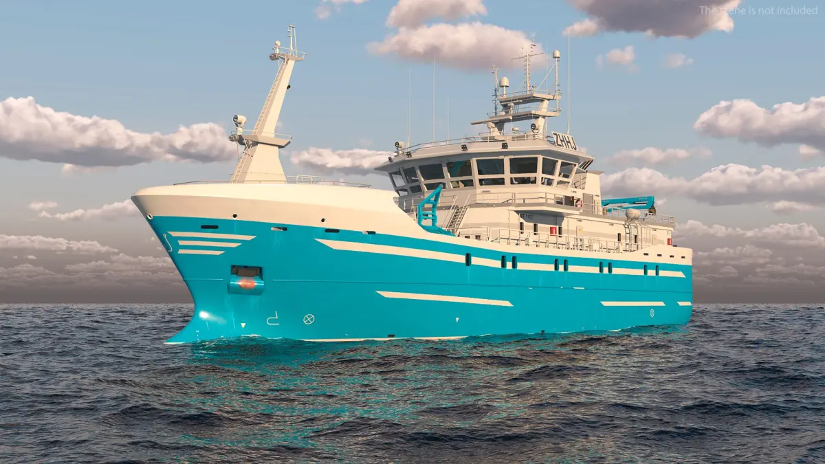 This fishing vessel model features a sleek and efficient design with advanced navigation and fishing technology. Equipped with robust cranes, it ensures the handling of heavy gear and large catches. The spacious deck and streamlined hull optimize stability and speed, making it ideal for deep-sea fishing. The model also includes detailed elements like antennas and safety railings, offering a realistic view of a contemporary fishing ship.