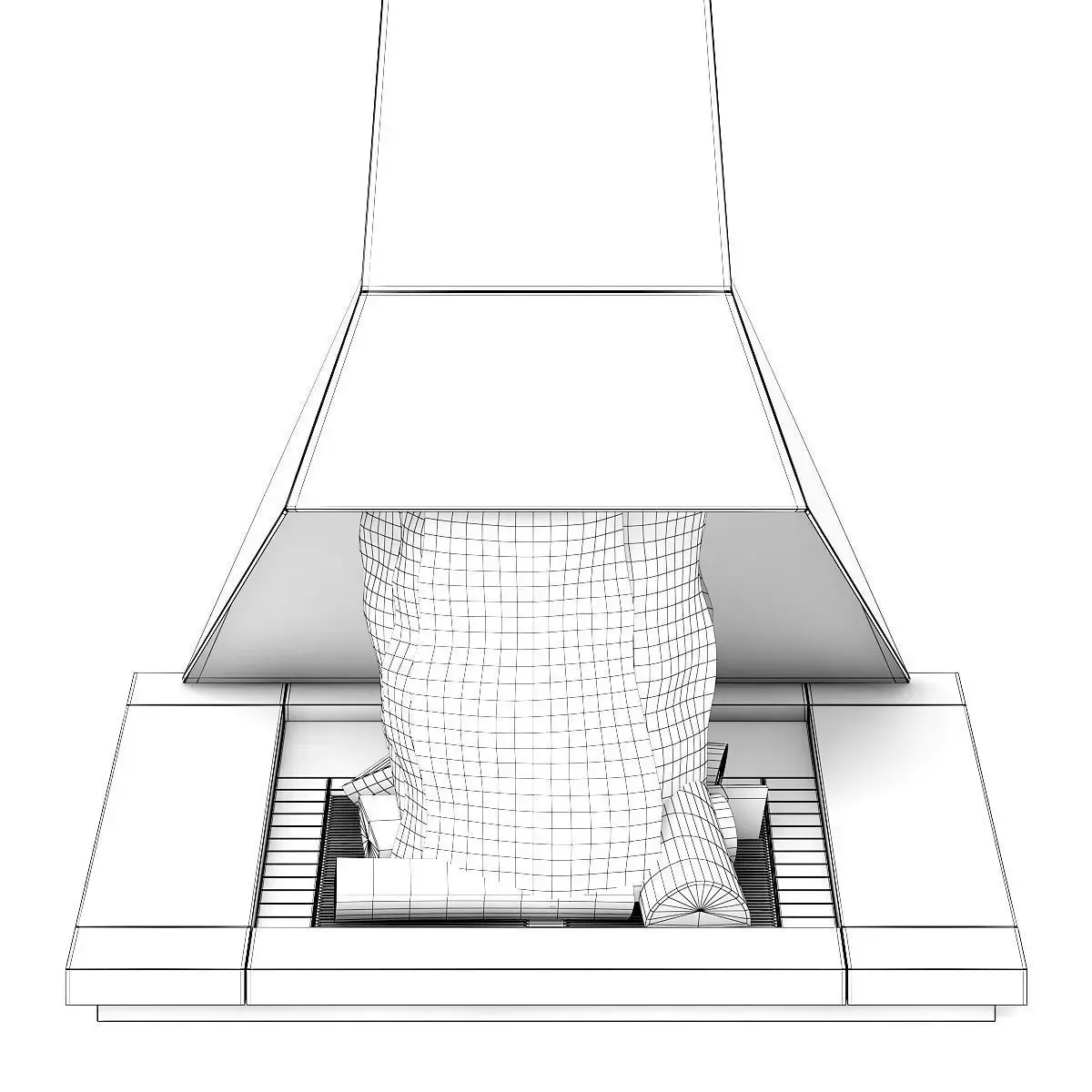 Large floor fireplace in modern shape. It has black marble stones at the bottom. This 3D model contains illuminative fire material.
