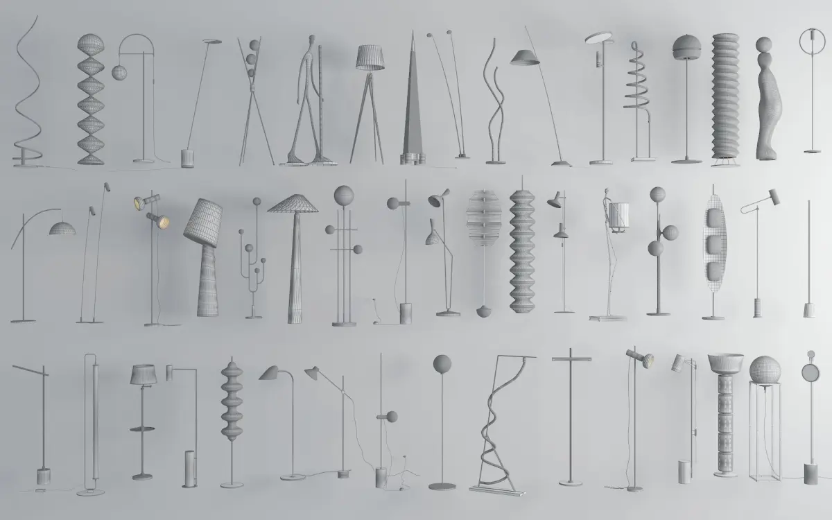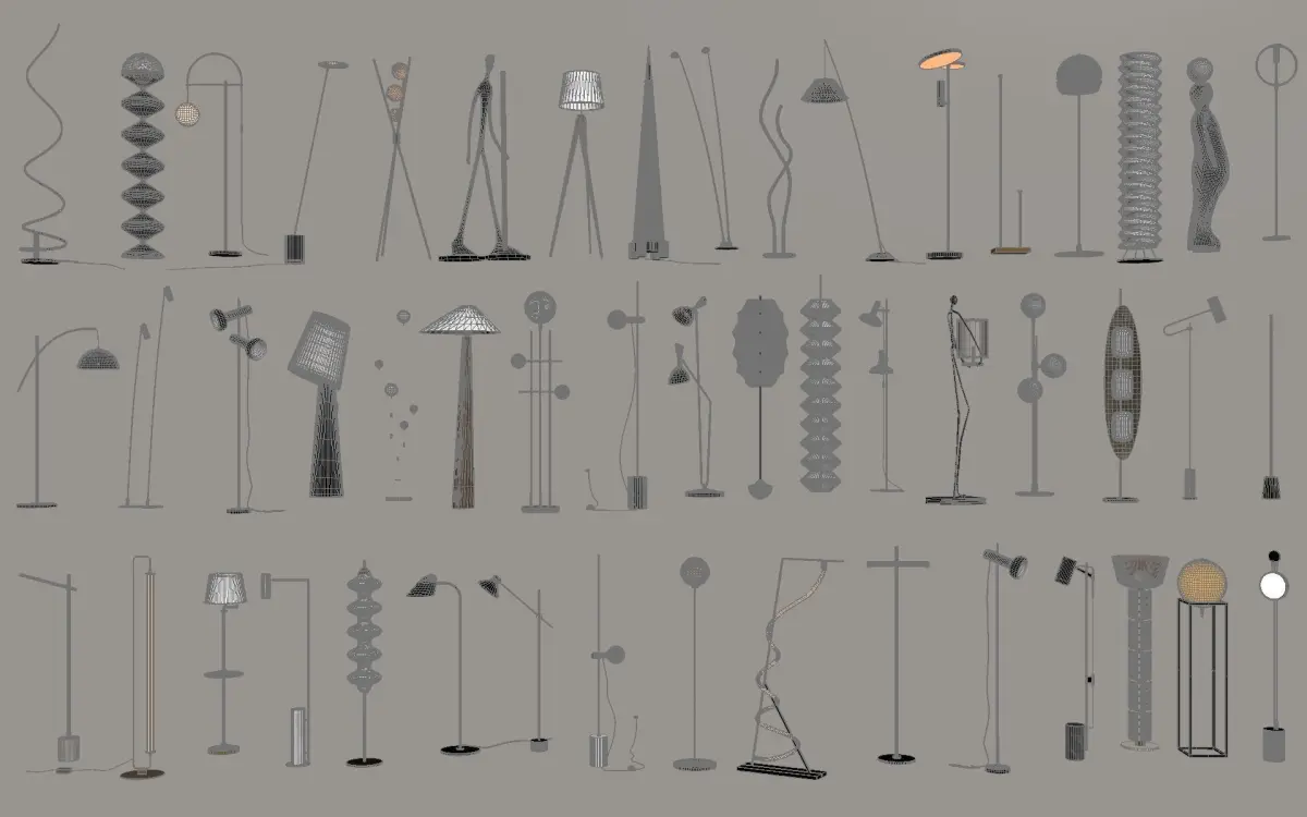 3D model set of diverse modern floor lamps, featuring minimalist, artistic, and retro - inspired designs. Ideal for interior decor, lighting design projects, adding style and ambiance to spaces.