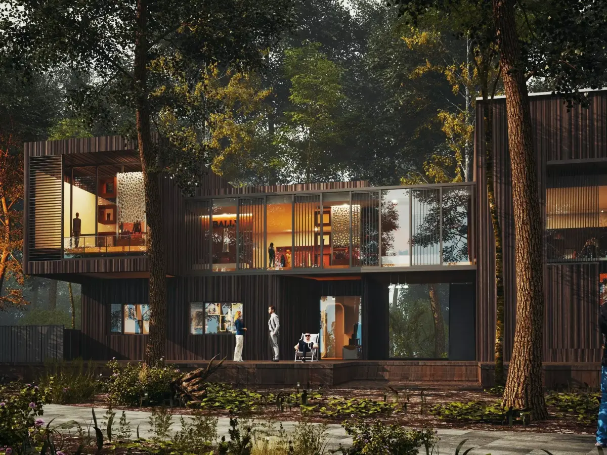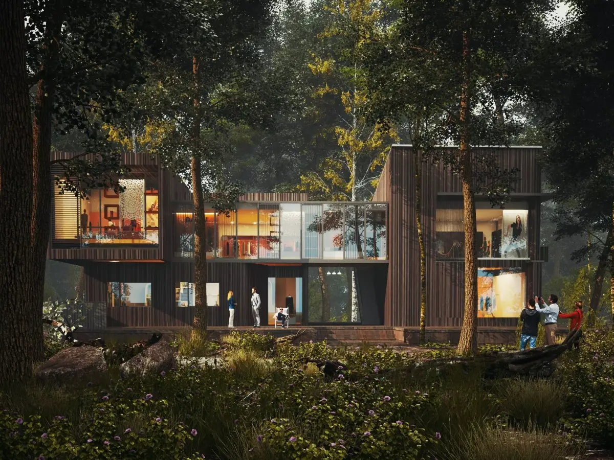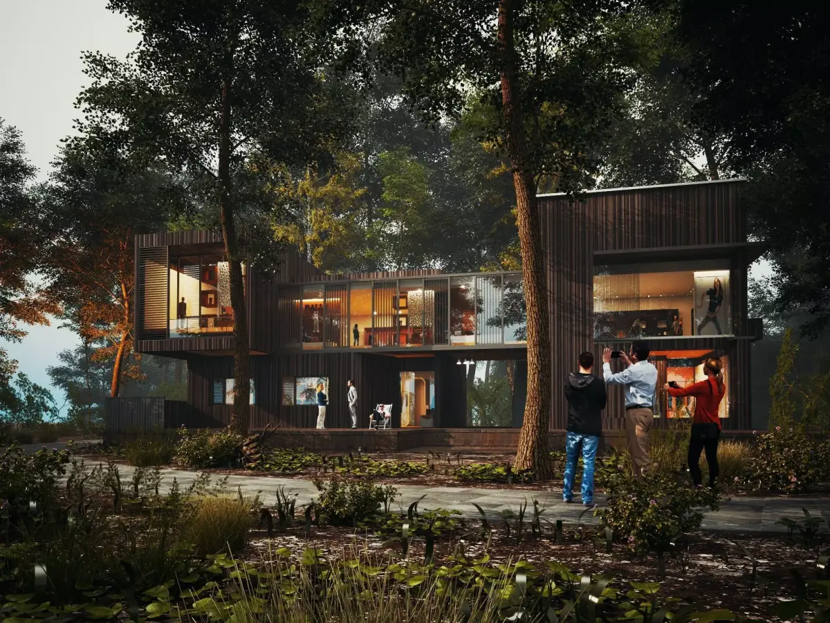 This 3D model features a modern forest house, designed with a contemporary architectural style and strong integration with the natural environment.The building is characterized by clean volumes, large glass façades, warm interior lighting, and a balanced combination of wood and modern materials.