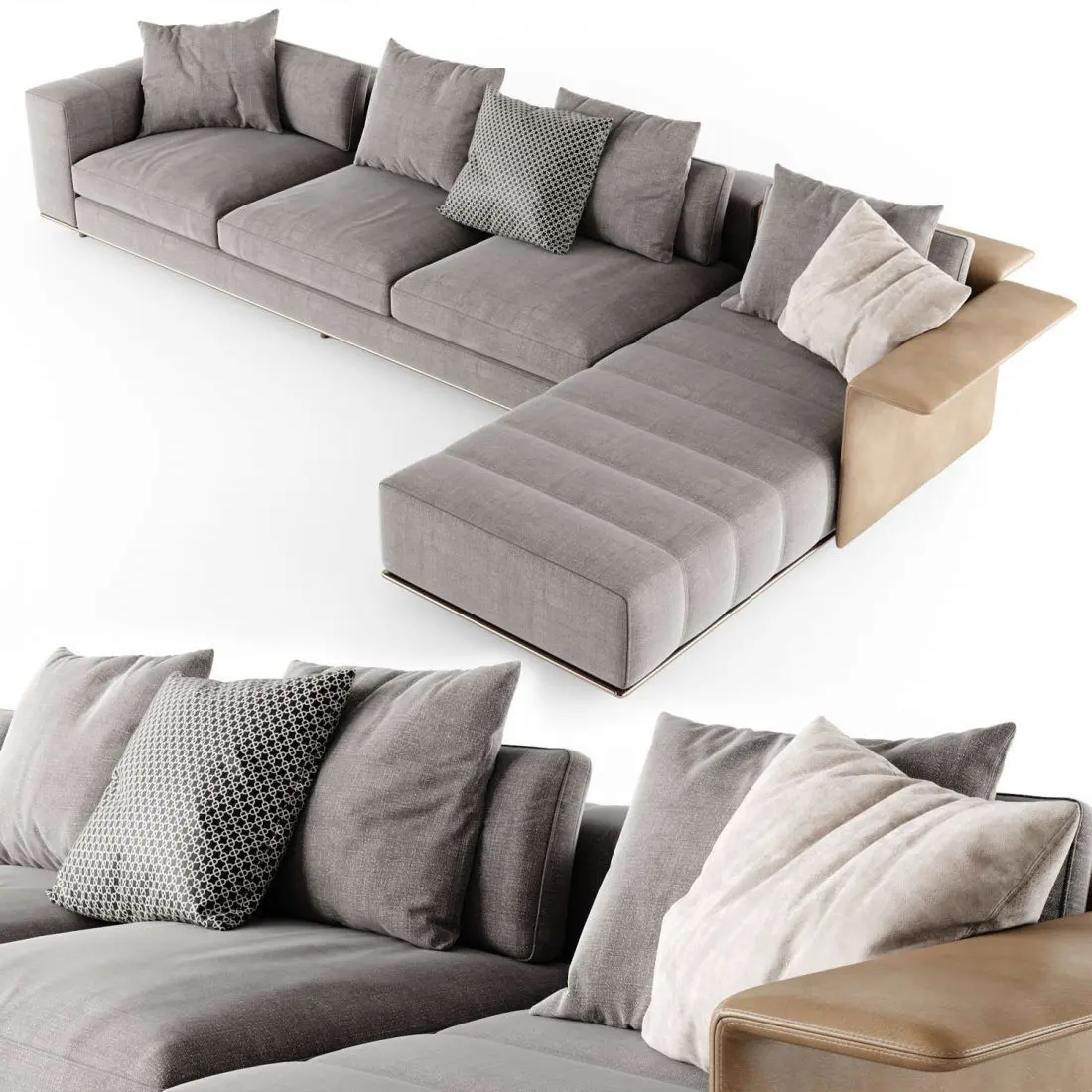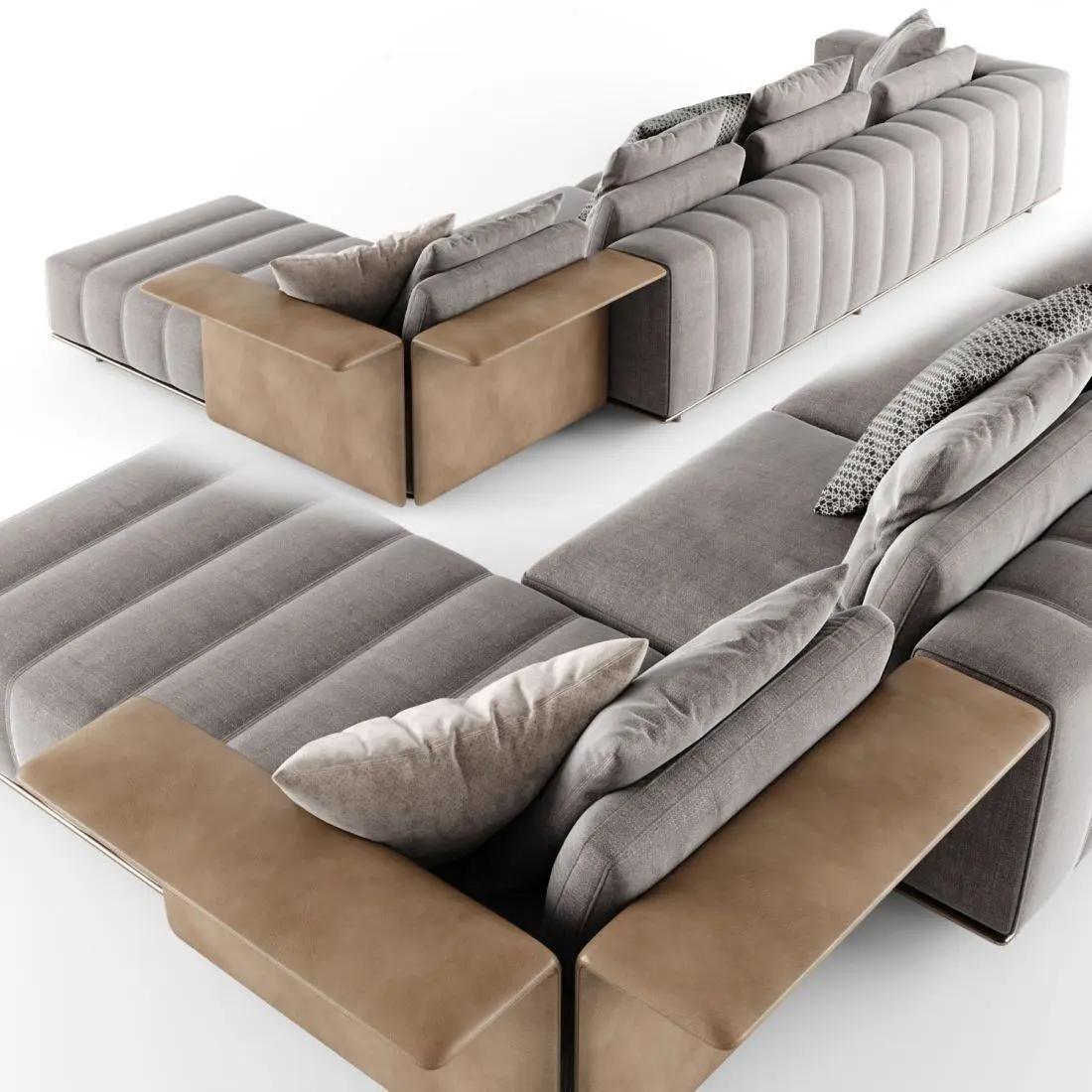 The seat cushions of the Freeman “Duvet” elements have a core insert in polyurethane, wrapped in memory foam padding and topped with a layer of soft down.For an overall effect of extreme softness, the entire structure of the Freeman “Duvet” is wrapped in a heat-sealed fiber covering.The armrests and backrests are embellished with a sophisticated stitching motif that is an eloquent expression of the company's tailoring skills. The pieces in leather or fabric are joined with a strip of bronze-colored eco-leather with a double-stitched pattern that rhythmically emphasizes the volume of the elements.