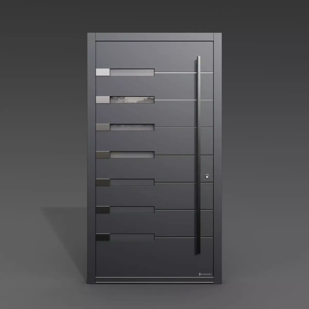 White Door: Central narrow glass panel, ideal for minimalist facades.Silver Door: Vertical glass strip with five horizontal inserts for a sleek, layered look.Dark Gray Door: Four square glass inserts arranged vertically, offering a bold geometric touch.Black Door: Central glass strip with eight staggered horizontal inserts, adding rhythm and contrast.Technical Features: