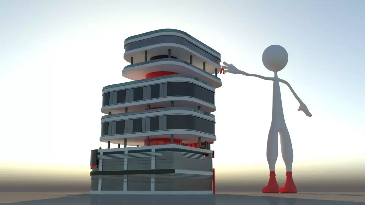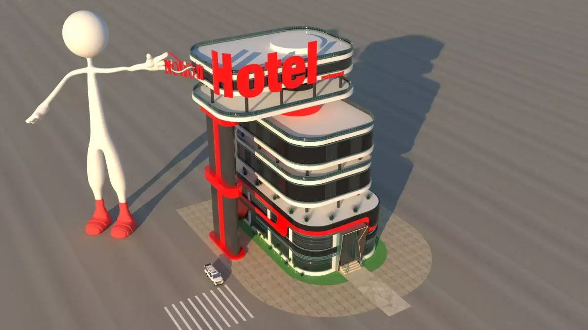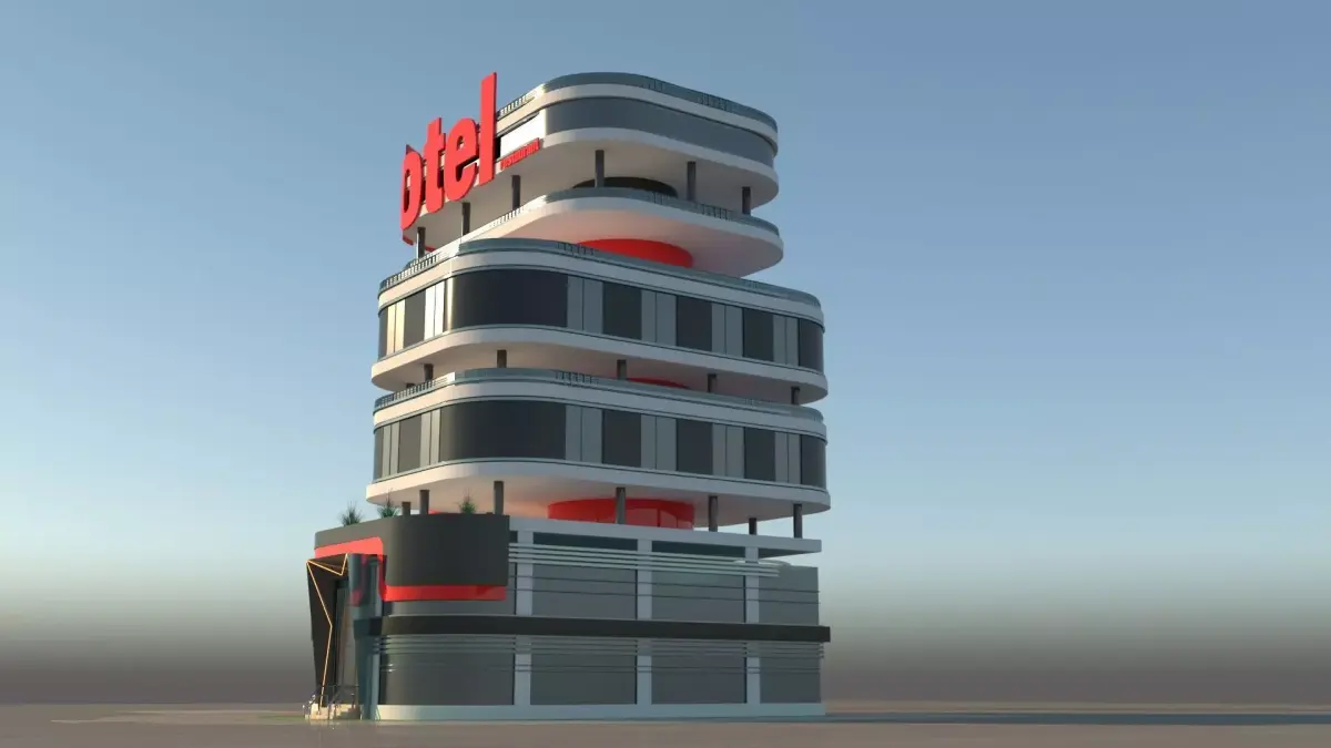 A highly detailed futuristic hotel exterior 3D model featuring smooth curved balconies, glossy glass facades, and bold red structural elements. The design includes a large stylized mascot sculpture and clean modern landscaping, making the model ideal for architectural visualization, animation projects, branding, and commercial presentations.Rendered with realistic proportions and clean geometry, ready for use in advertising, walkthroughs, and high-quality renders.