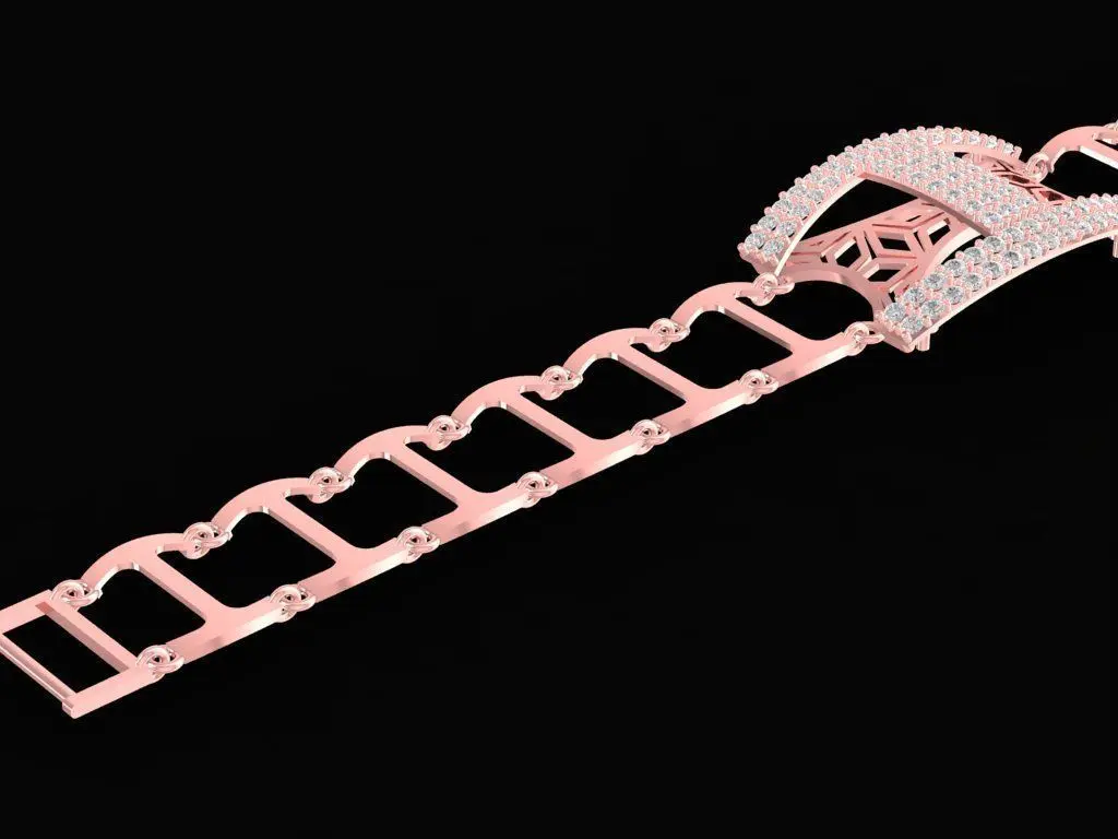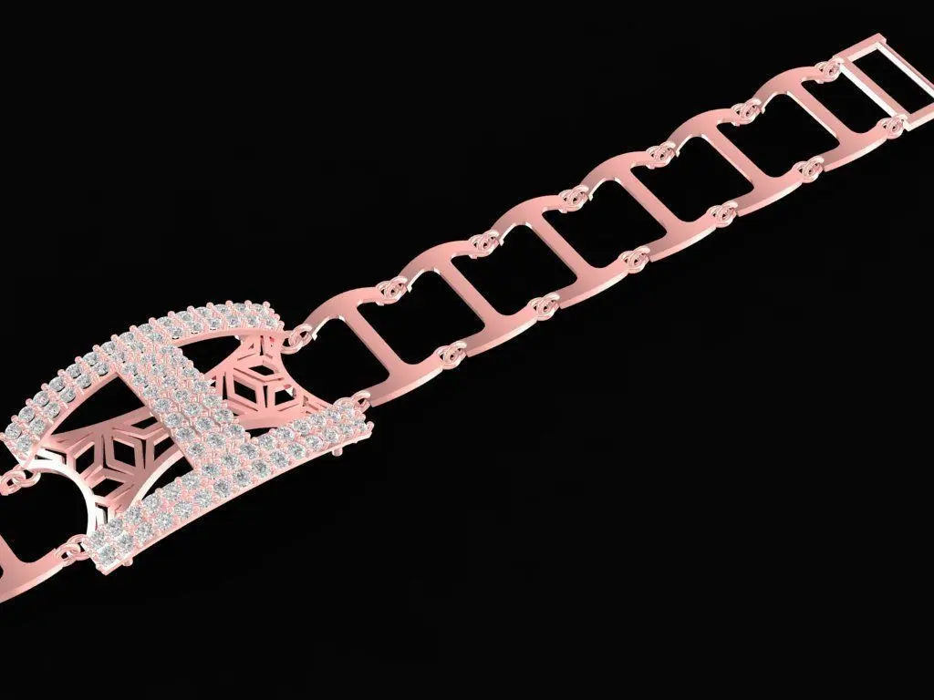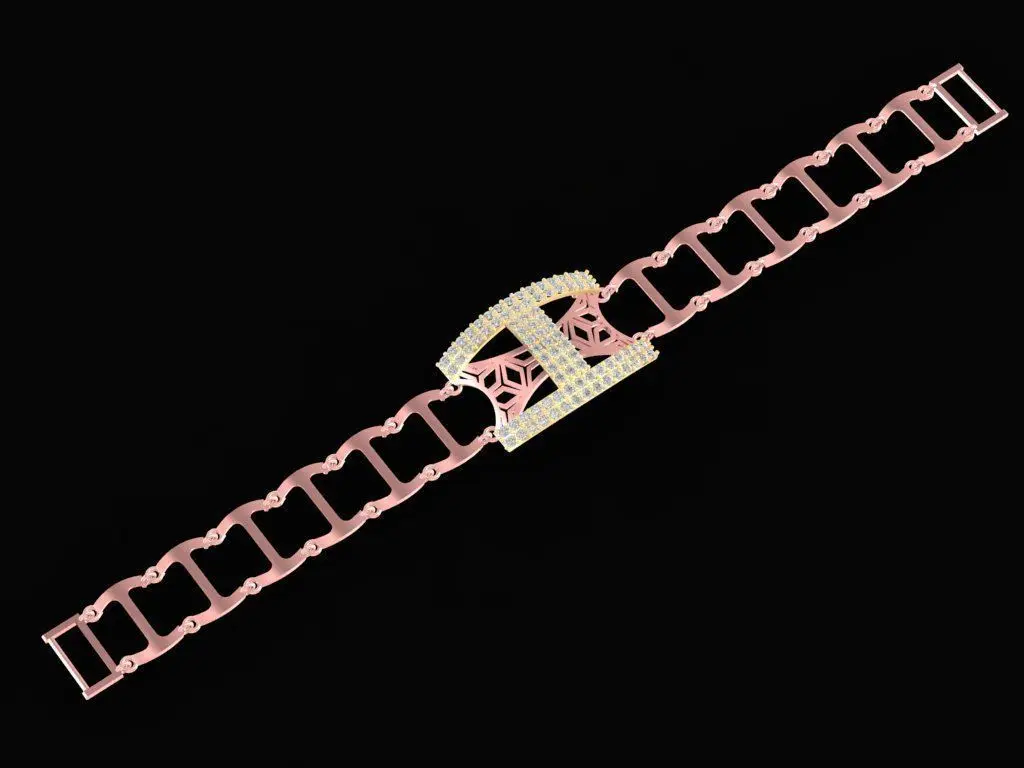 This 3D model represents a modern men’s bracelet featuring a geometric link structure and a bold centerpiece paved with white diamonds. The elegant rose gold frame enhances the masculine aesthetic, blending luxury and strength in a contemporary design.