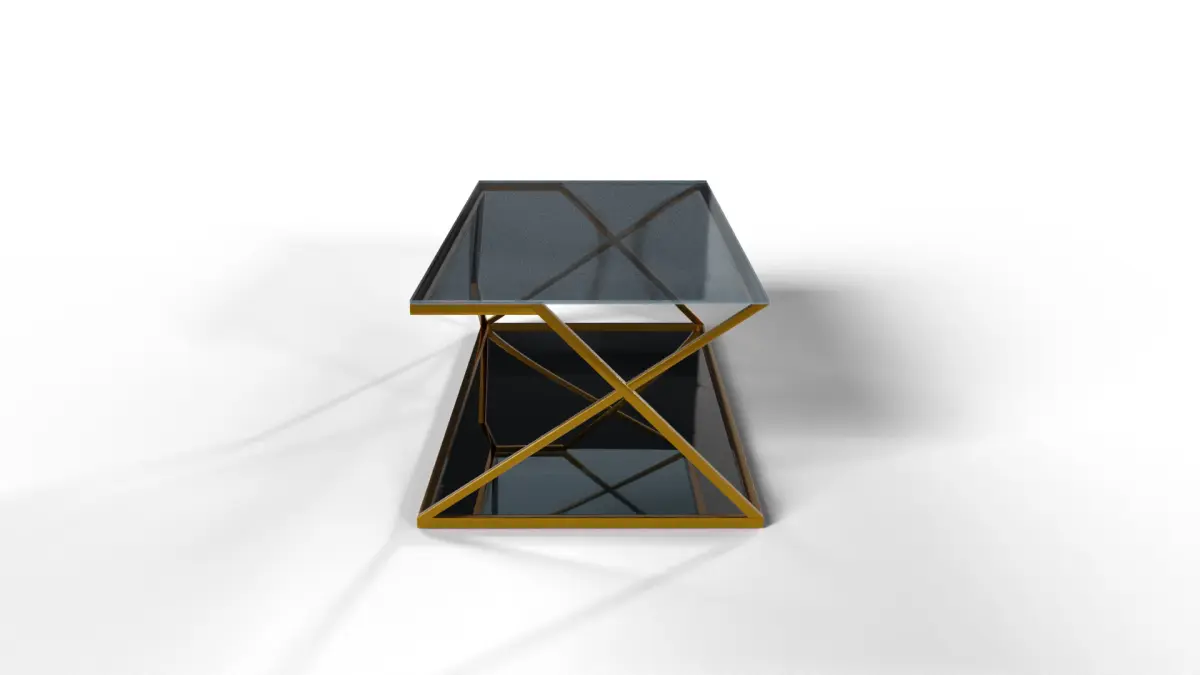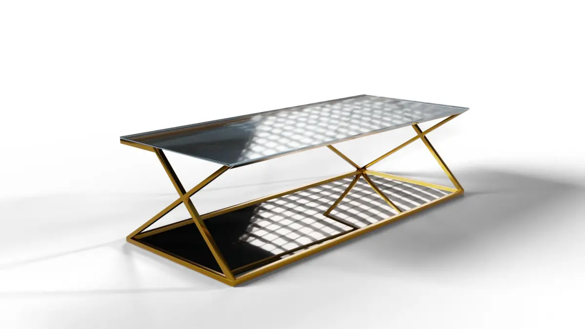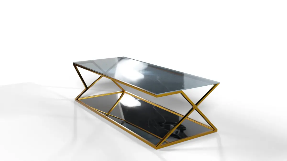 This elegant coffee table combines a sleek golden metal frame with a glass top and bottom, creating a refined and contemporary design perfect for a variety of interior styles. The unique geometric structure adds a dynamic and luxurious touch, making it an ideal centerpiece for modern living spaces or commercial environments.