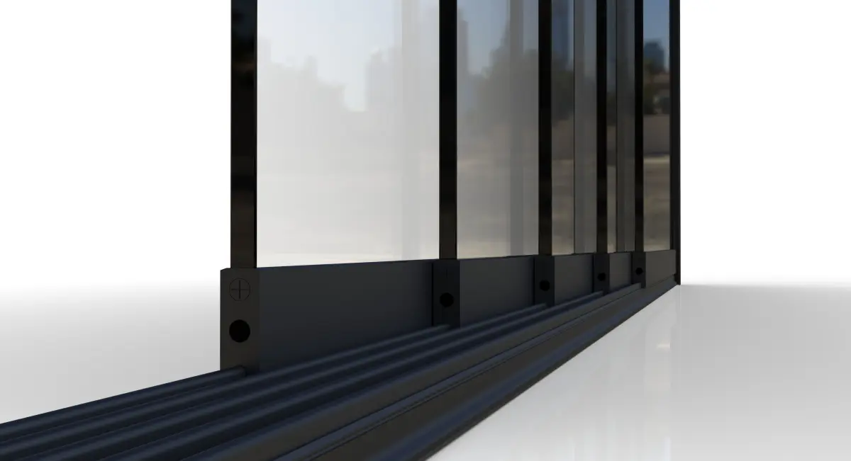 This is a highly detailed 3D model of a modern glass sliding door system, designed for architectural visualization, interior design, real estate presentations, games, or virtual environments. The model includes precise detailing of the aluminum frame, floor-mounted rail system, and glass panels with realistic materials.