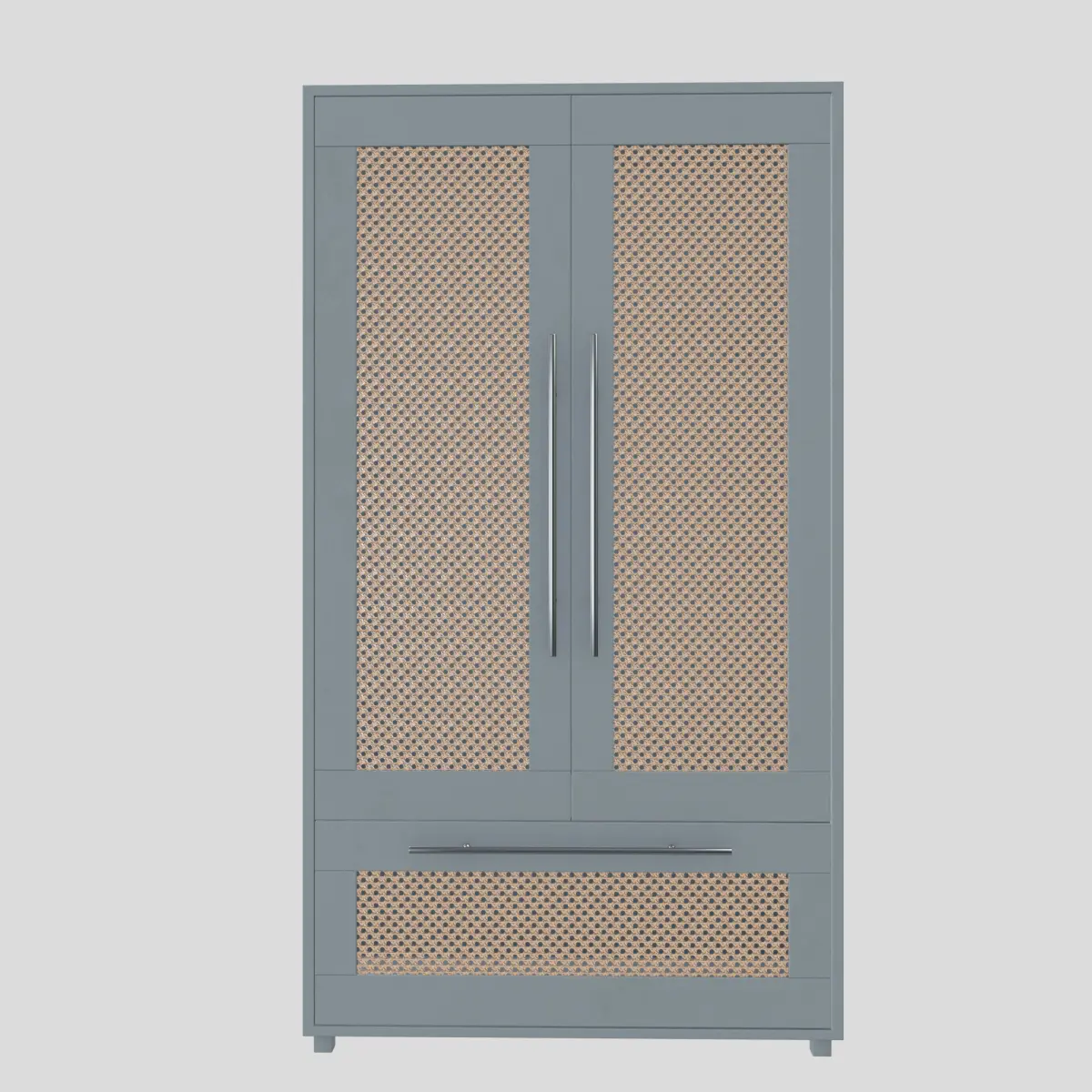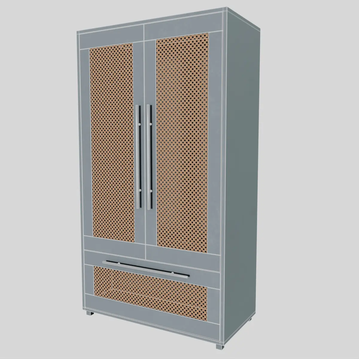 This is a high-quality PBR (Physically Based Rendering) 3D model of a modern wardrobe, designed to bring a touch of contemporary style to any interior. The wardrobe features a sleek gray frame with two doors and a bottom drawer, all accented with elegant wicker panel inserts. The long, slender handles add to its modern aesthetic.
