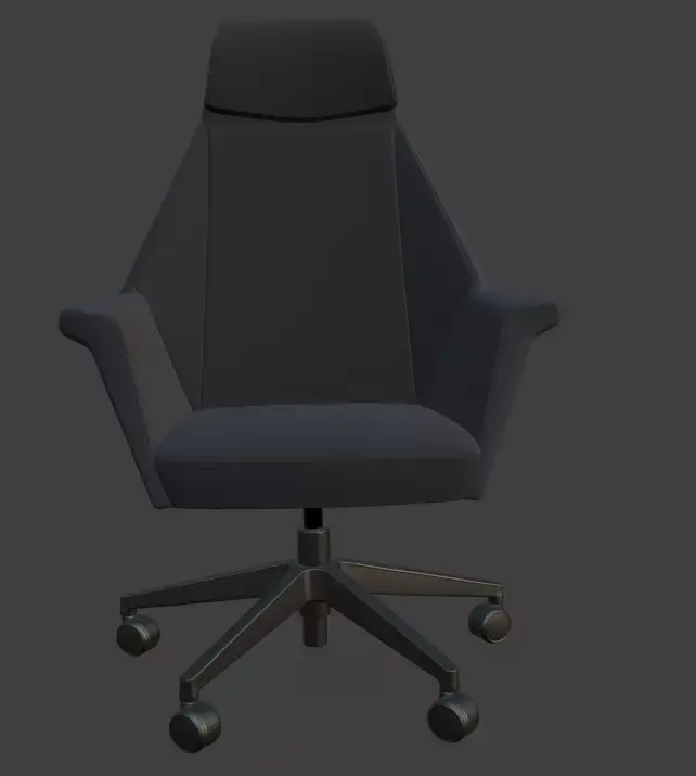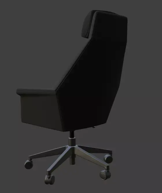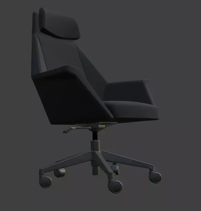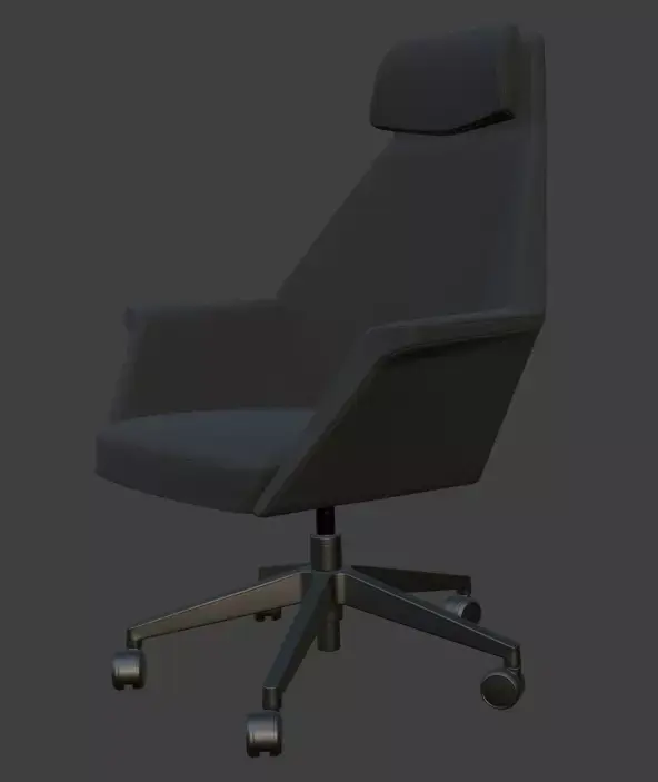Sleek and contemporary high-back executive chair with sharp geometric lines, soft dark-gray fabric upholstery, integrated headrest, padded armrests, and polished chrome five-star base. Ideal for modern corporate offices, luxury home offices, architectural visualizations, cinematic interiors, VR experiences, and high-end game environments.Real-world scale (centimeters), clean quad-based topology optimized for subdivision, non-overlapping UVs. Includes full 4K PBR texture set (BaseColor, Roughness, Metallic, Normal, Height, AO). All objects and materials are properly named and organized. Ready to use in Blender, Maya, 3ds Max, Cinema 4D, Unreal Engine, Unity—no plugins required.