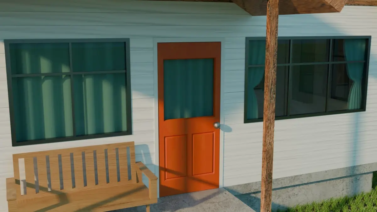 - Exterior: The exterior includes a welcoming front porch with a wooden bench, perfect for showcasing the house’s inviting nature.
