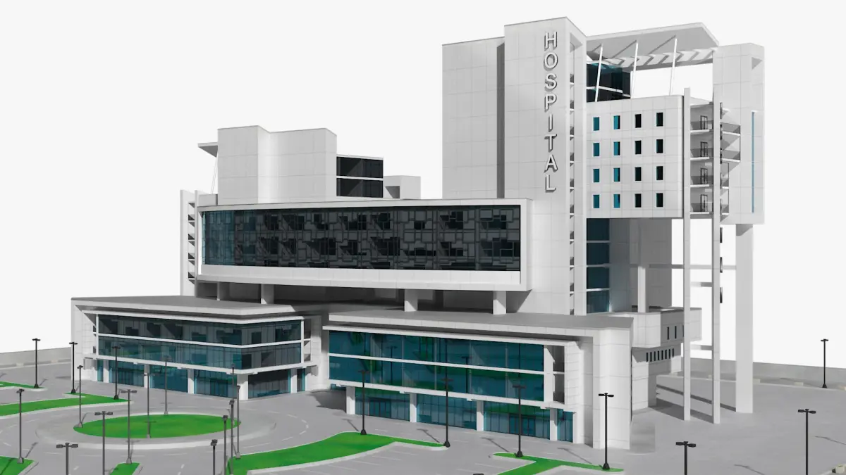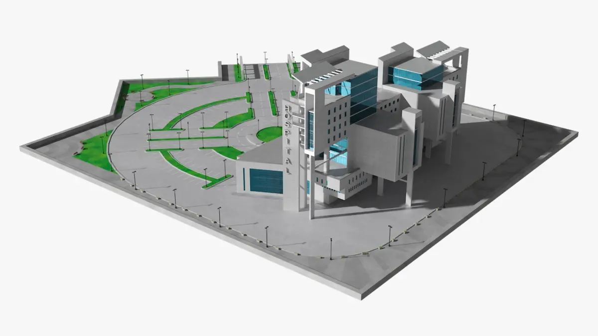 This model includes detailed components such as multi-story buildings, emergency entrances, parking facilities, and landscaped areas. Designed to reflect a functional and modern healthcare environment, it captures the essential elements of a fully equipped hospital complex, making it ideal for professional and creative applications.