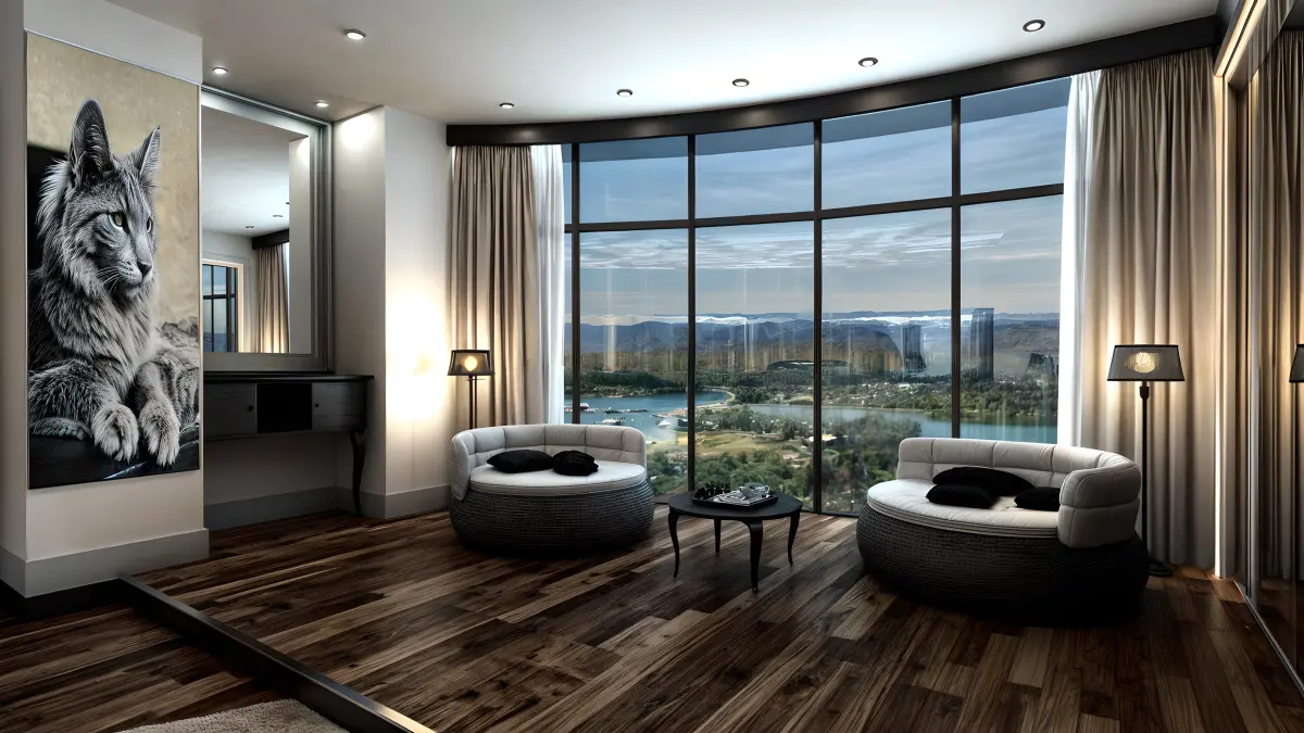 Modern lighting fixtures, including floor lamps and recessed ceiling lights, are strategically placed to highlight key areas of the room while providing a soft, ambient glow. The carefully selected furniture pieces and decorative elements reflect a contemporary design ethos, ensuring that every detail contributes to the overall sense of luxury and comfort.