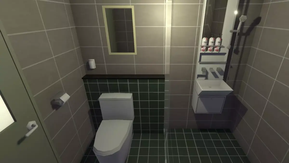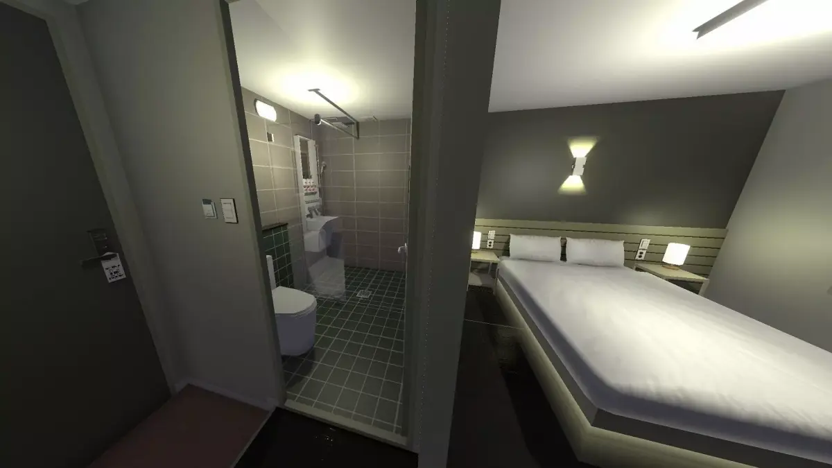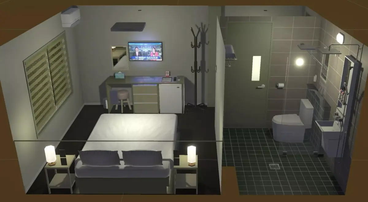 Modeled after a real-life hotel in the seaside town of Sokcho, South Korea. Typical design of a small, modern hotel room in Korea, Japan, or Asia.