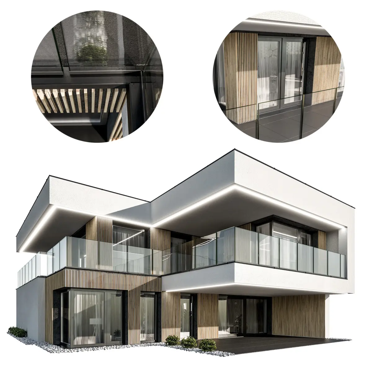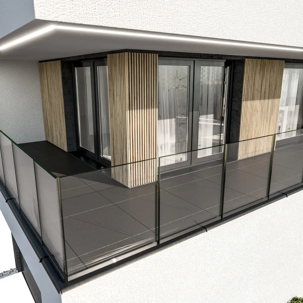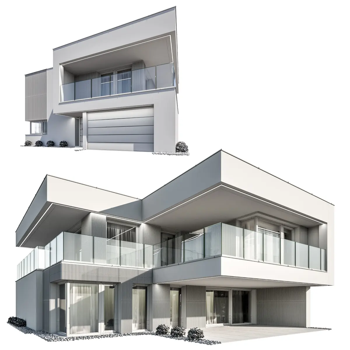 The buildings elements (outside walls, interior walls, balconies, glass panels, windows, roof, chimneys, sills, railings, small bushes outside) are 3D models