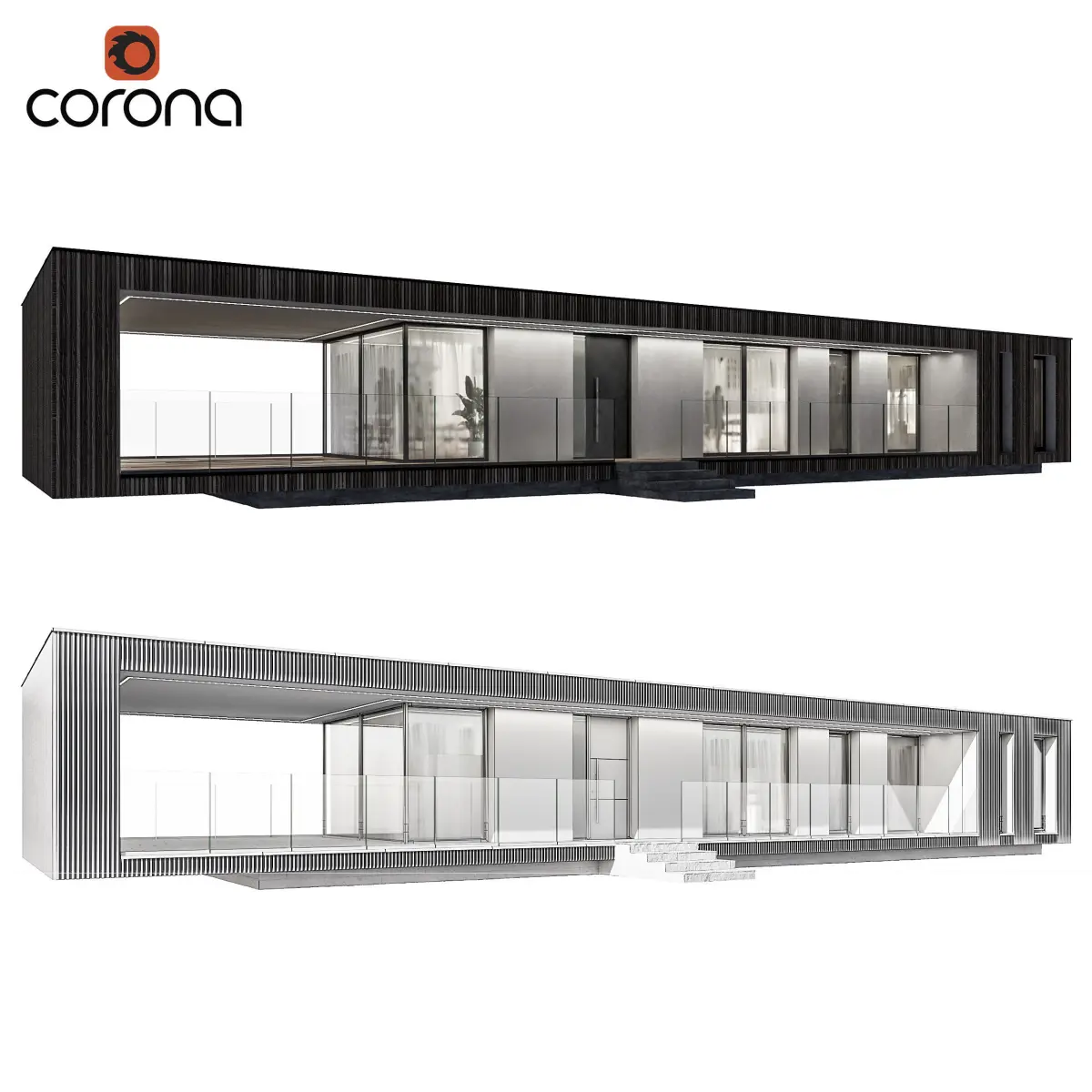 Interiors are 3-dimensional (walls) with various furniture as textures on planes (plants, lamps, kitchens etc.) and with most lights on (for night renders).