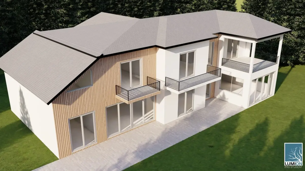 Modern house with exterior design. Two floors. Big terrace. Can be positioned on a flat terrain.