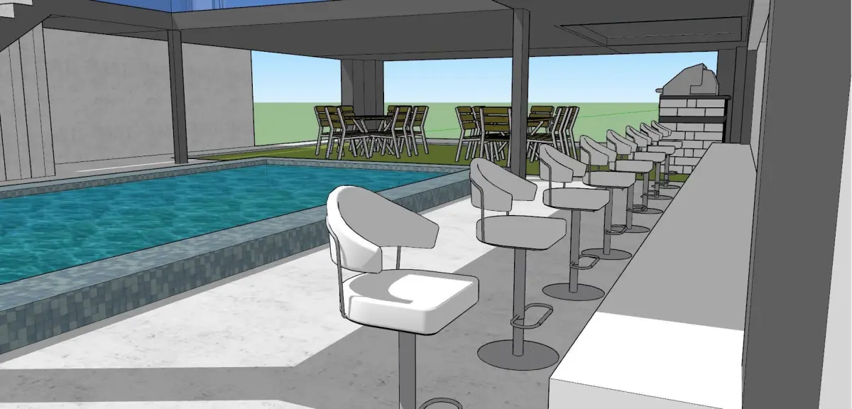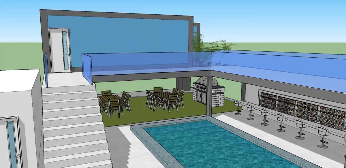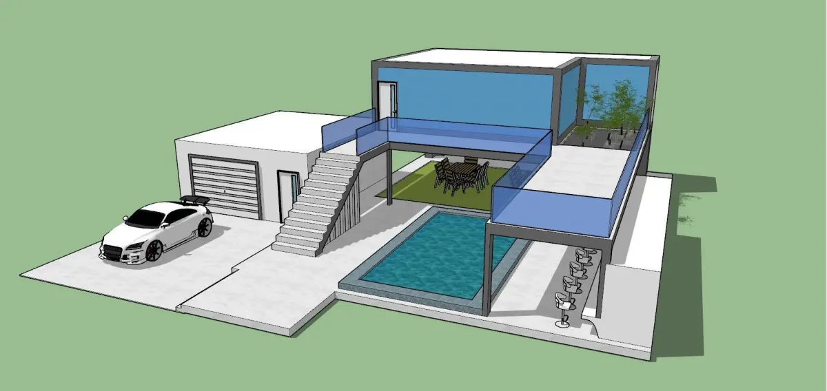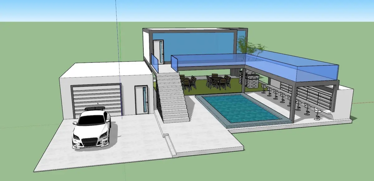 Simple yet cool modern house design containing: house, pool, outdoor bar, garage, outdoor benches, grill, and a car for a generous $5 Made in Sketchup 2017. visit my instagram profile 'instagram.com/3designer_990' to see more of my designs