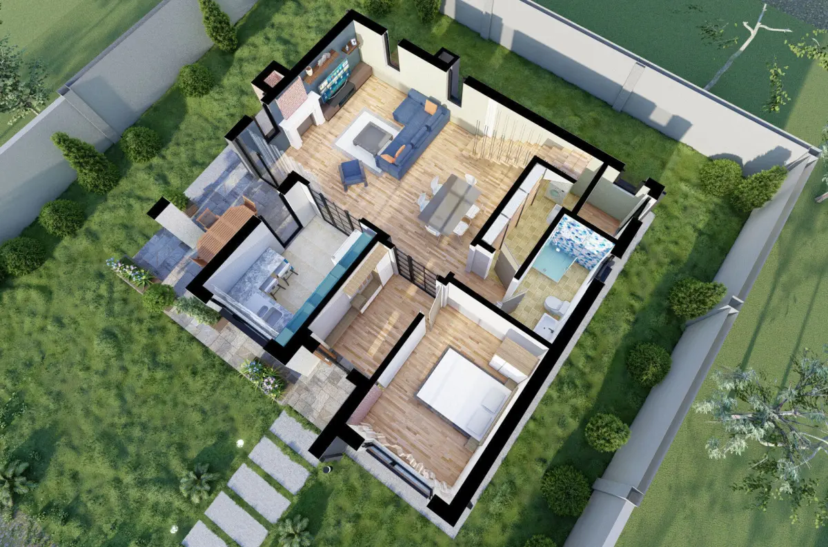 - Furnished interior, including living room, kitchen, bedrooms, and bathrooms3D Model Details: