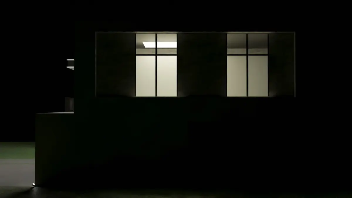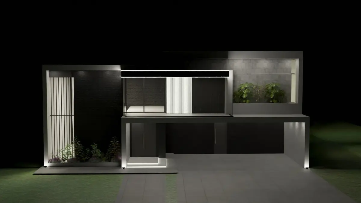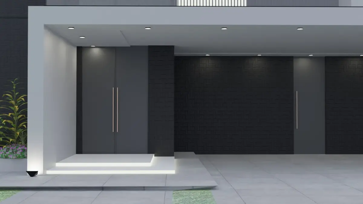 two storey modern house, there is a garage and plants and flowers near several windows, there are more houses in my profile