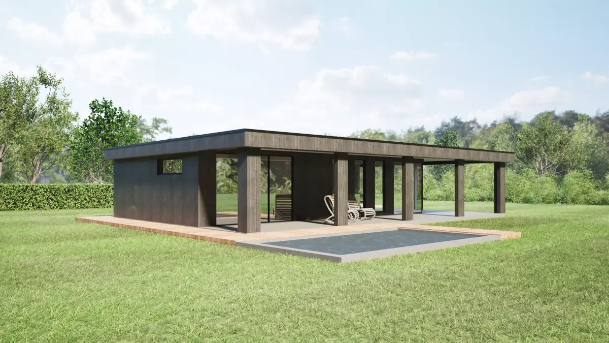 - Detailed 3D model of a modern flat roof wooden house / bungalow