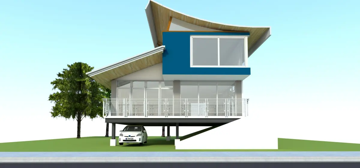 Steel is the choice of material for its structural members to add to the structure's modern feel. Elevating the structure gives it additional space for parking and takes advantage of relatively small lot areas. This also creates a cooling effect on the flooring.