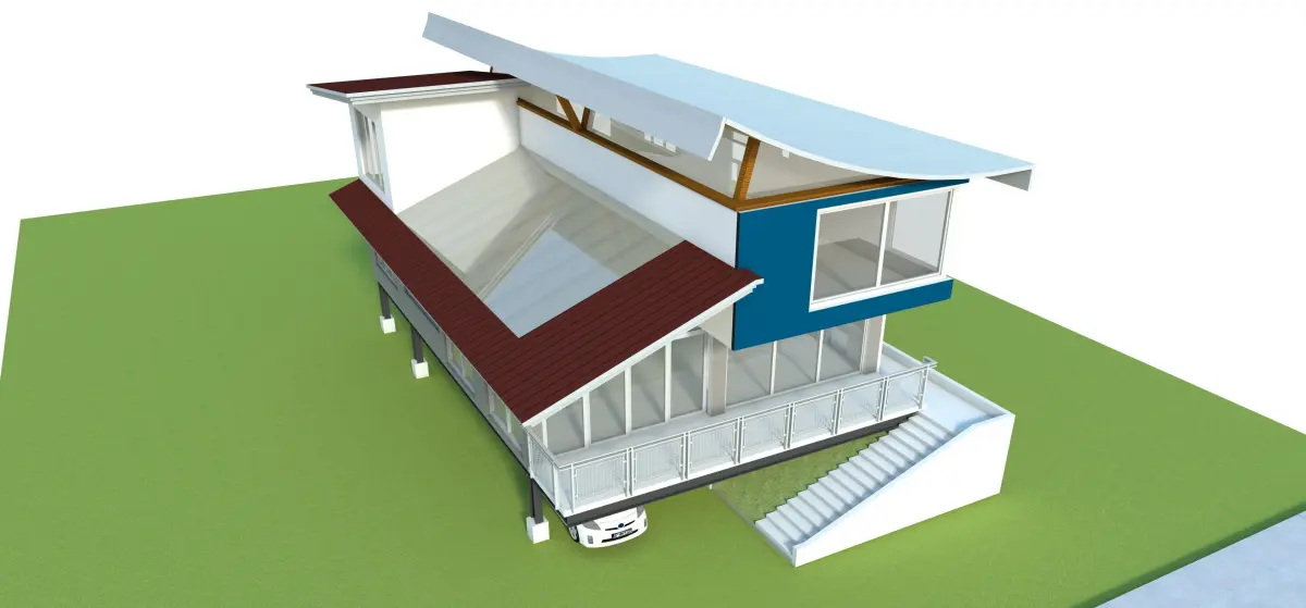 The structure was designed to have an open feeling thru dominant use of large windows and sliding glass doors together with the usage of semi transparent polycarbonate on one of its roofing for additional sunlight. Also, the other roof has been curved upwards to accomodate higher ceiling and additional windows.