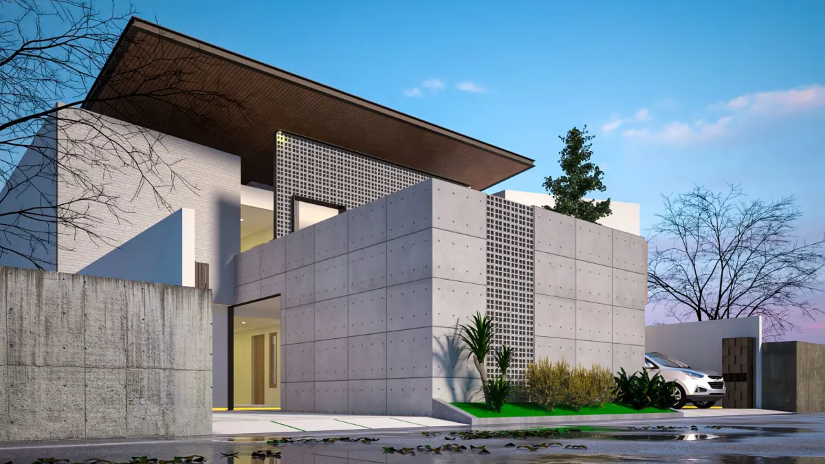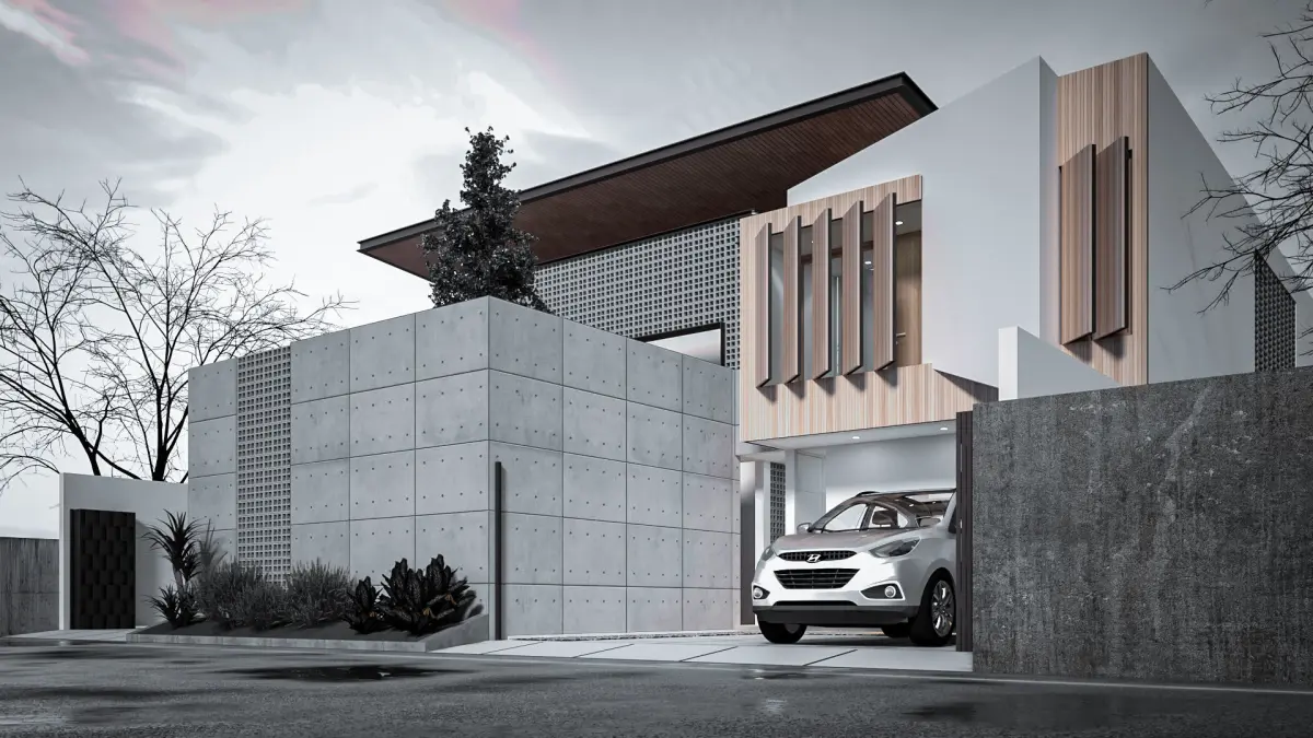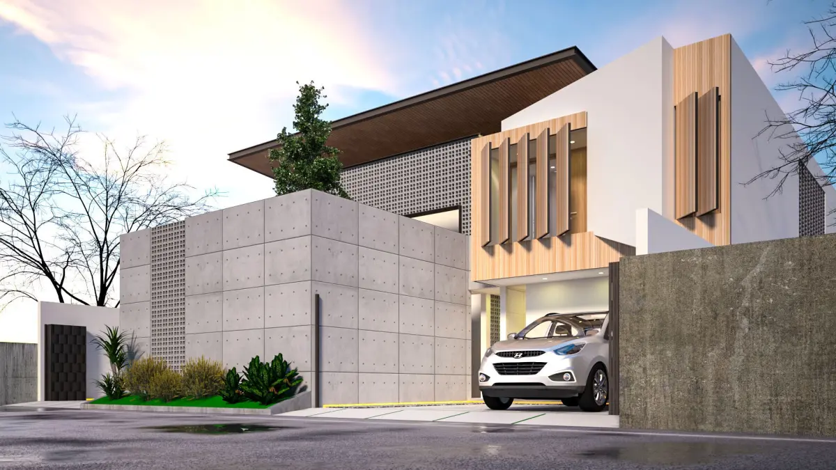 IB House is designed to have three functions, namely Residential, Office, and Boarding House. By having three building masses, the design that is carried is a contemporary style or a design that is currently up-to-date. When viewed from the front, the front of the building is used as a mini-office. Wall was designed as if it were a guardrail from the outside area with a concrete roster accent that can maximize air in and out of the room (cross ventilation). In the area to the right, it is used as the primary residence. While on the left, it is used as a boarding house with nine rooms with private bathrooms.The public zone in the residential house (project: IB House) has the concept of open space, living room, kitchen, and pool connected without solid insulation to create a more comprehensive impression. The combination of solid white wall materials and furniture with wood color makes the room brighter and cleaner. Following the character of the residents who want to create family activities that are thicker and more harmonious, the concept of open space is one of the tricks to realize this.