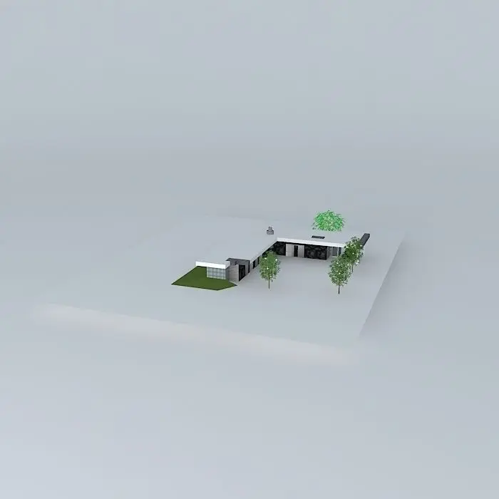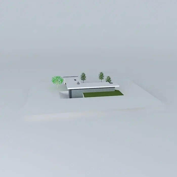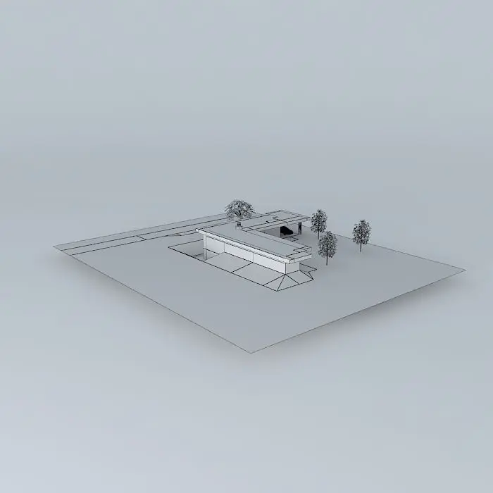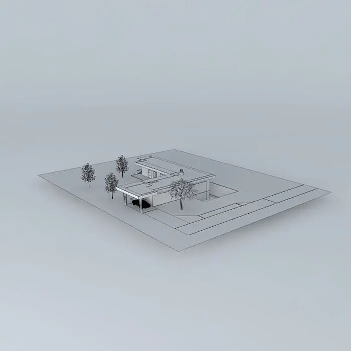 This 3D model was originally created with Sketchup 8 and then converted to all other 3D formats. Native format is .skp 3dsmax scene is 3ds Max 2016 version, rendered with Vray 3.00 L shaped glass and aluminum house with an atrium and carport. The flat roof overhangs the entire house. Clerestory glass block windows are in the front, while the back has floor to ceiling windows.