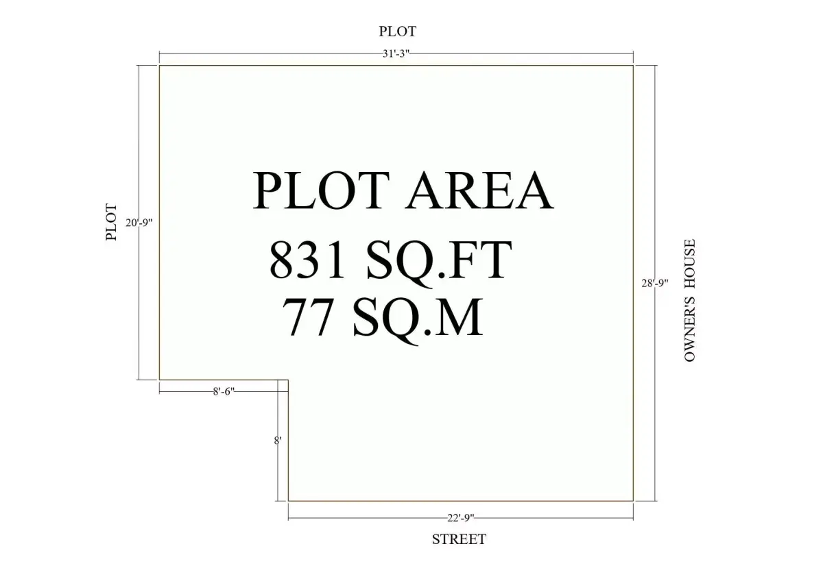 The plot area is 77 square meters (830 square feet) with direct street access. The facade design follows a contemporary architectural approach using clean volumes, balanced proportions, horizontal window lines, and a combination of modern plaster finishes with brick texture accents. The overall composition enhances curb appeal while remaining practical and suitable for dense residential neighborhoods.
