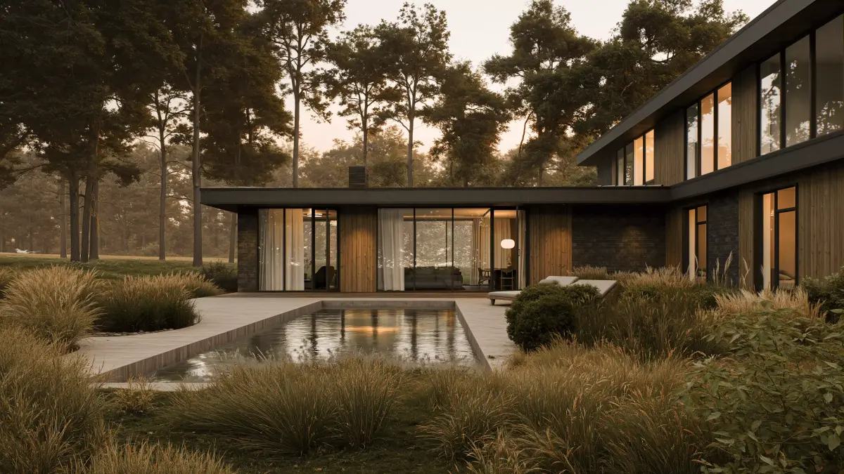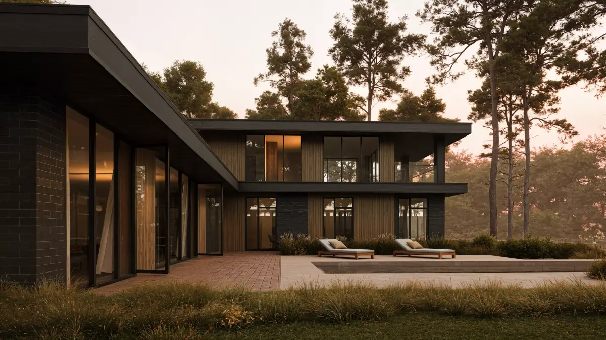 A contemporary minimalist home that blends modern geometry with natural warmth. Featuring clean lines, floor-to-ceiling glass, and a refined mix of wood and dark stone, it harmonizes seamlessly with its forest surroundings to create a serene, light-filled living space that celebrates simplicity and connection to nature.