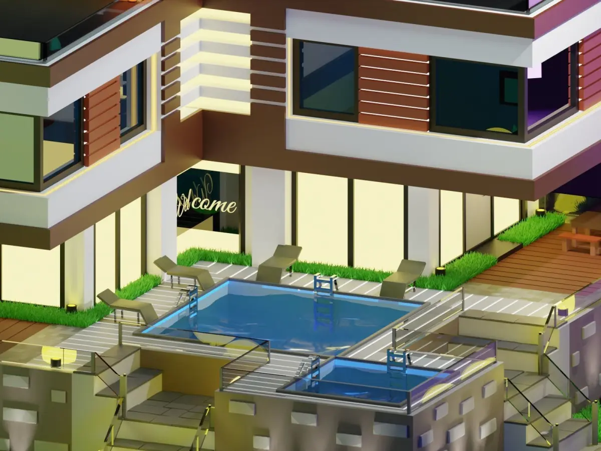 It is a perfect model of Modern House that can be use for different purposes. This looks more Amazing in a Night View Projects or group of Models. This Model of House has Swimming pool, Tables, couch and sunloungers which enhance it's look. And also the Colored lights spot towards the House makes it more Amazing.