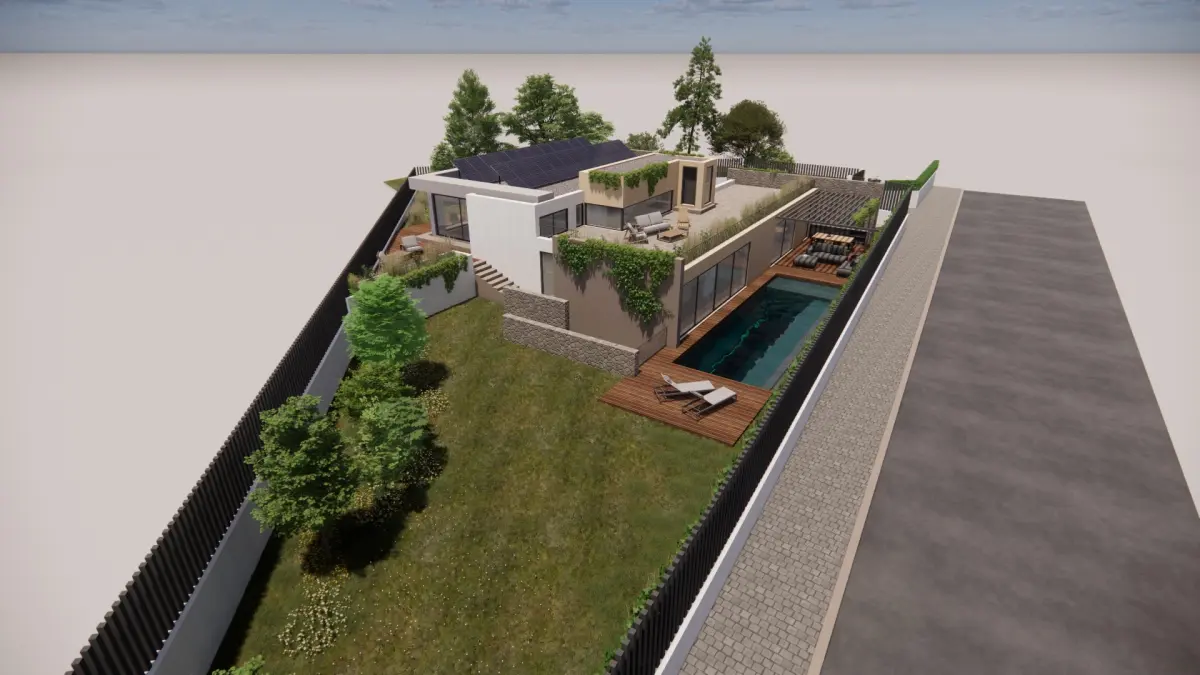 The design features a contemporary single-family home with:3 Spacious BedroomsOpen-plan Kitchen and Dining AreaLiving Room and Home OfficeGarage with an Integrated Lounge AreaSwimming Pool and Surrounding GardenElevated Private Patio at the Rear