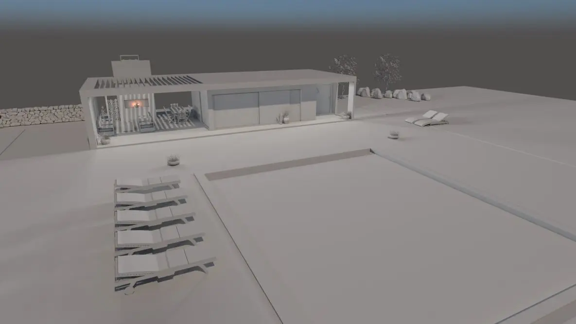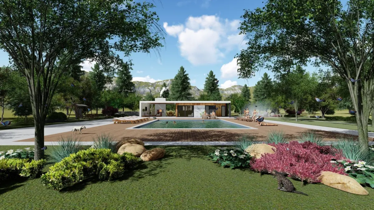exterior of Modern vacation house/tiny house,contemporery house with swimming pool and fireplace with terrace.Modern designed mobile house on 40 m2 with terrace and unique designed terace with fireflace..Unique designed,highly detailed model with lot of useful 3D models and outdoor furniture in it and lounge on terrace...Different facade variables are possible ,from stone,PVC or wood planks.Also feature a paintings from my friend.On the back front of the house,there is big and nice covered terrace .Suitable for sea site area as for the mountain areas.Model is done with sketch up 2017 pro and rendered with v-ray 3.4. All textures high resolution,have been checked and are included in scene.Model is easy to manipulate and ready to render with v-ray.Real world scale and exact proportions cm. Realistic and correctly scaled !• Excellent polygon & texture efficiencyPurchasing this model , you get files in different formats as :skp,dea.3ds.fbx ask designer for different formats.Additional Textures provided with the model: