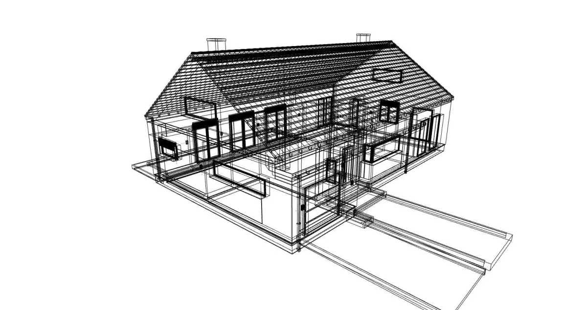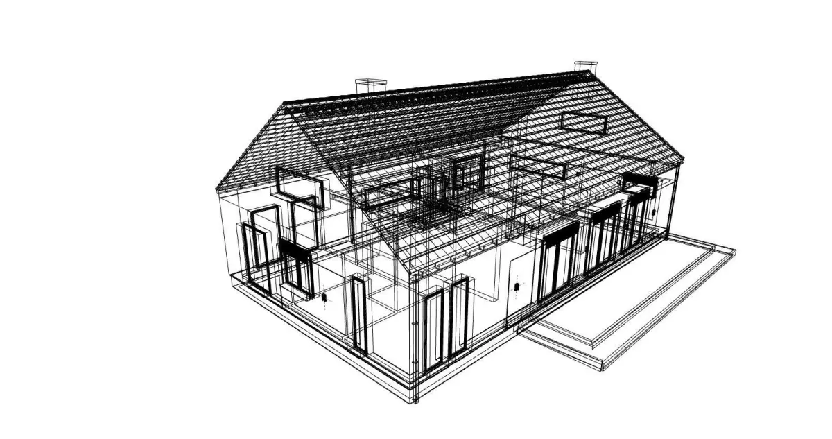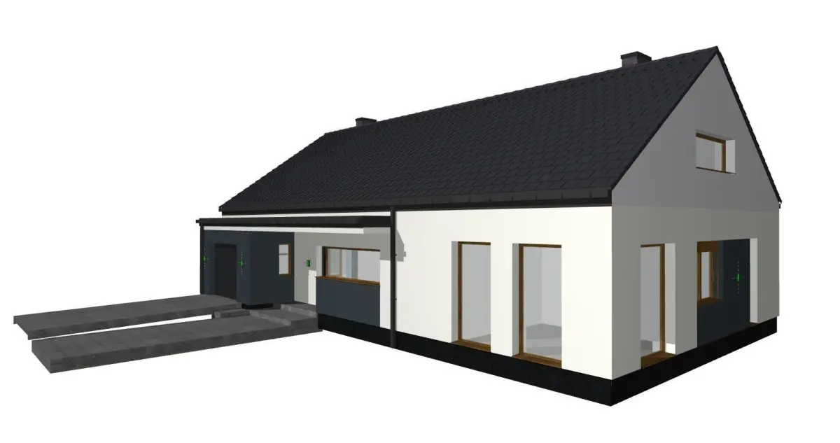A model of a modern single-family, one-story house made as an external body. The model has a full body visible on the visualization as well as car lights, driveway and fence. The model does not include the environment such as grass, trees, vehicles or people.