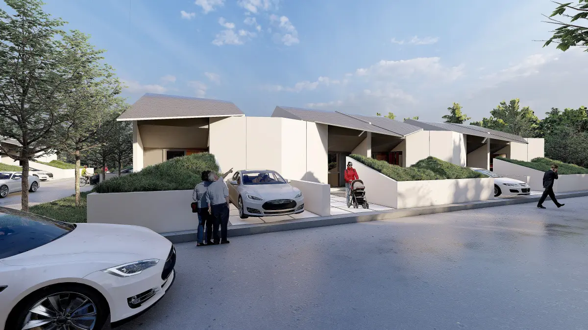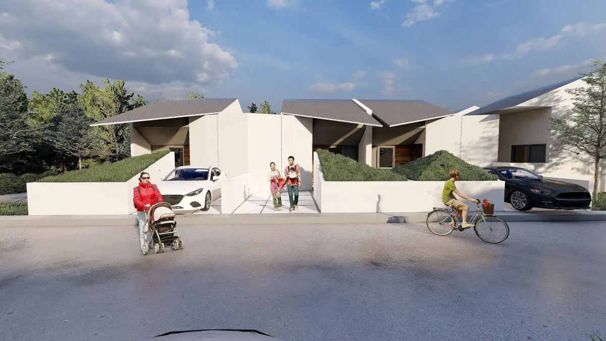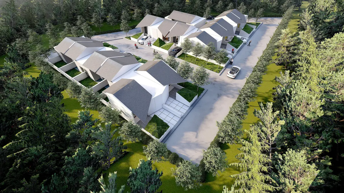 The houses follow a simple typology, arranged in a compact yet spacious site layout, with defined access roads and green areas.
