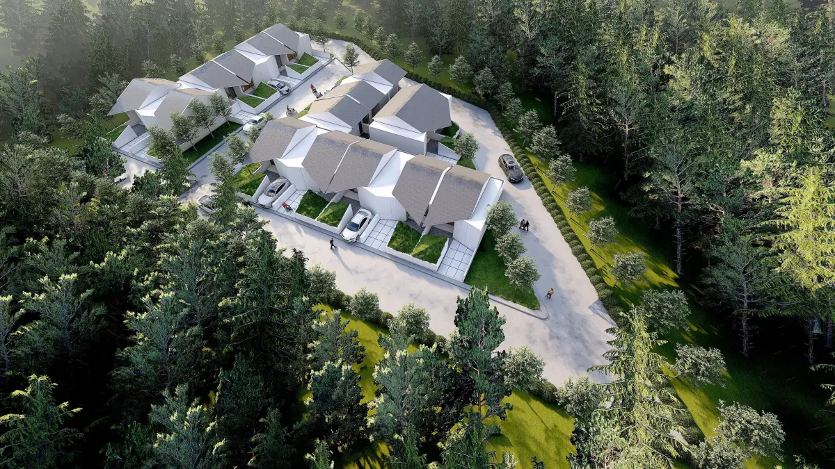 A complete 3D masterplan of a modern housing complex consisting of 16 identical residential units, designed in a clean and efficient layout.