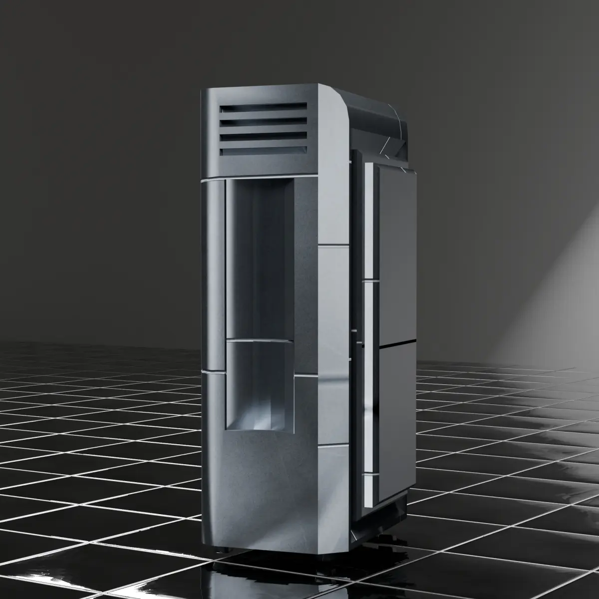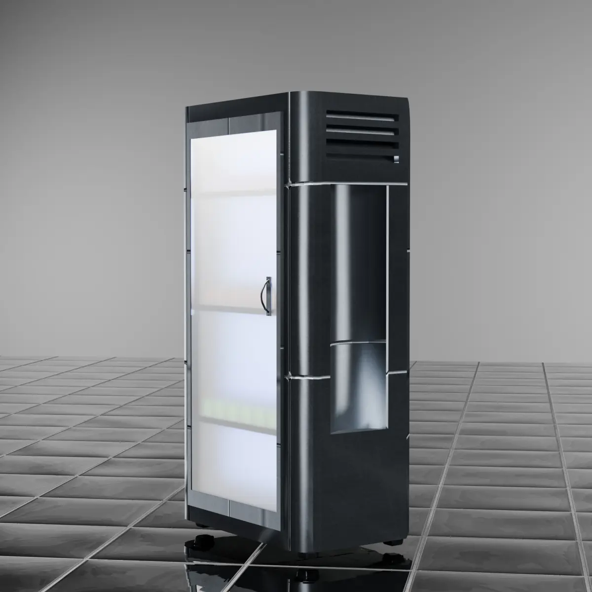 This 3D model represents a modern industrial refrigerator with a high level of detail, featuring a textured and UV-unwrapped design for realistic rendering. The exterior is covered with a dark metallic texture, showcasing subtle reflections and scratches that enhance the industrial look. The transparent glass door reveals neatly arranged shelves with colorful bottles—pink at the top, orange in the middle, and green at the bottom—adding vibrancy and realism to the scene. The chrome handle reflects its surroundings convincingly, emphasizing the attention to material accuracy.