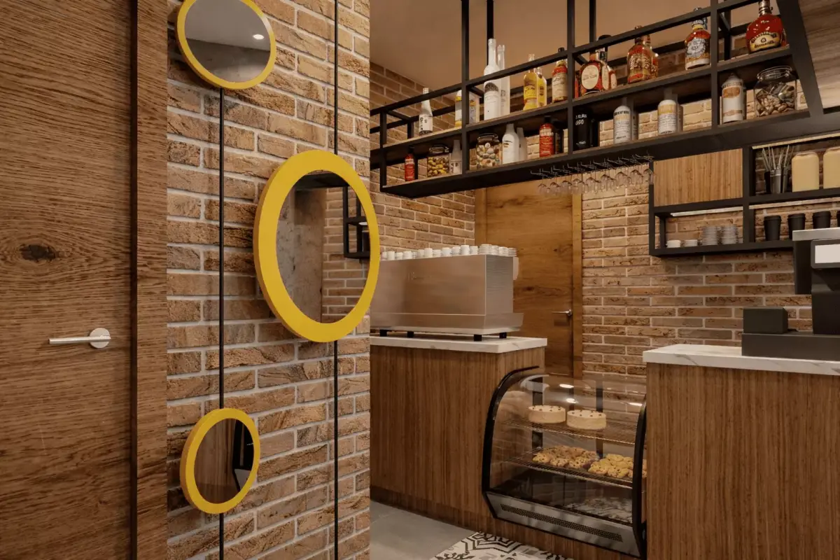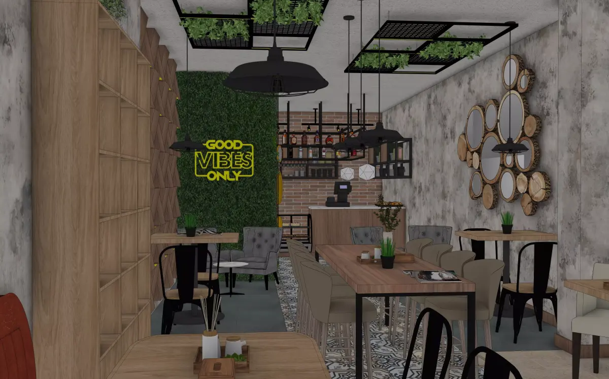 This is a professional, high-quality 3D interior scene of a modern industrial coffee shop, designed with a Good Vibes Only concept. Perfect for architectural visualization (ArchViz), interior design inspiration, or commercial use. The scene features a balanced mix of warm wood textures, rustic brick, and raw concrete finishes.