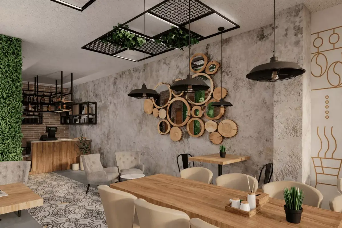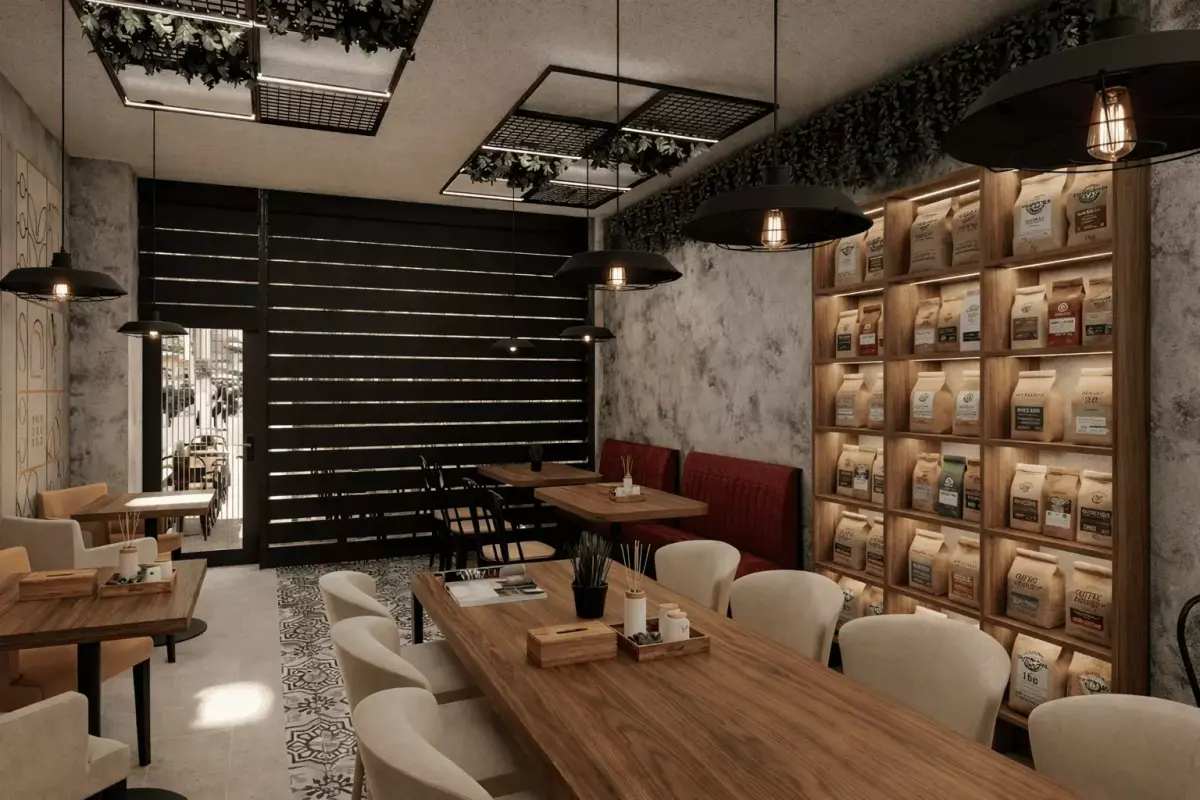 Assets Included: Full bar setup, coffee bean packaging (shelved), modern seating, industrial pendant lights, and realistic indoor greenery.