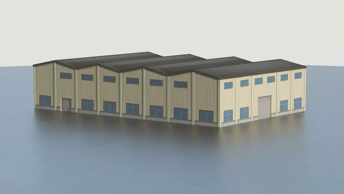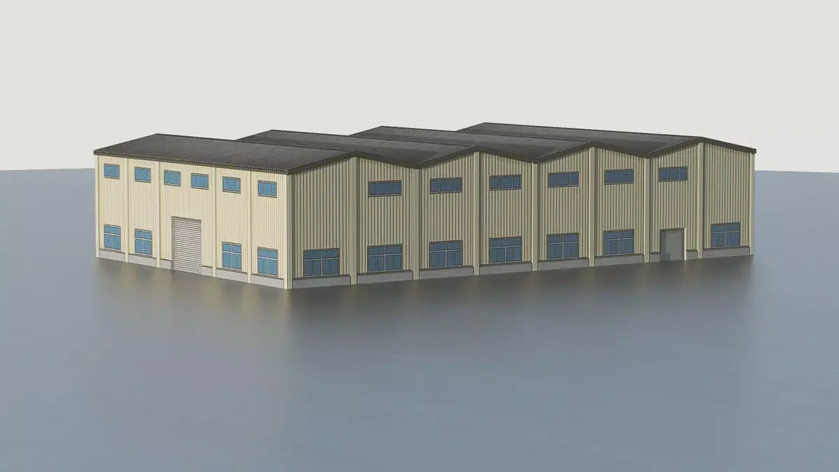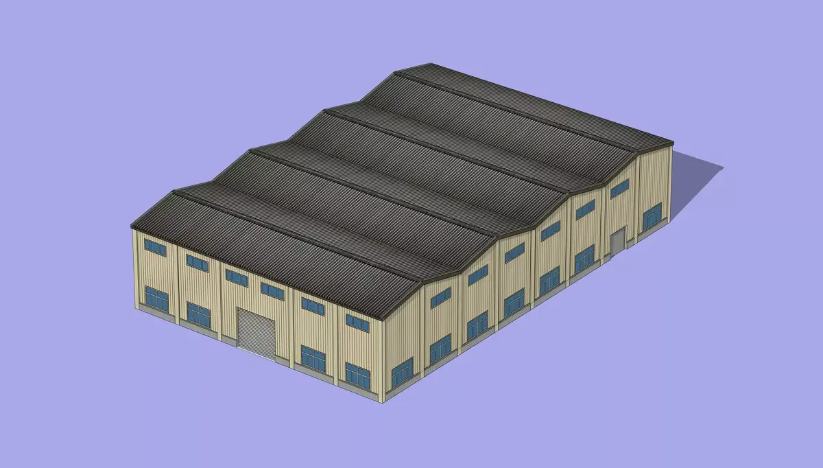 This 3D low poly model represents a large, modern industrial warehouse with a distinctive multi-gabled roof and corrugated metal siding. Designed for efficiency and scalability, the model features clean geometry and a modular aesthetic suitable for a variety of industrial or logistics-themed scenes. The exterior includes detailed elements such as large roll-up doors and regular window patterns, adding realism without compromising performance. Optimized for real-time applications, this asset is ready for use in games, simulations, or architectural visualizations where performance and visual clarity are key.