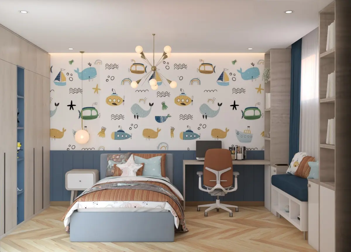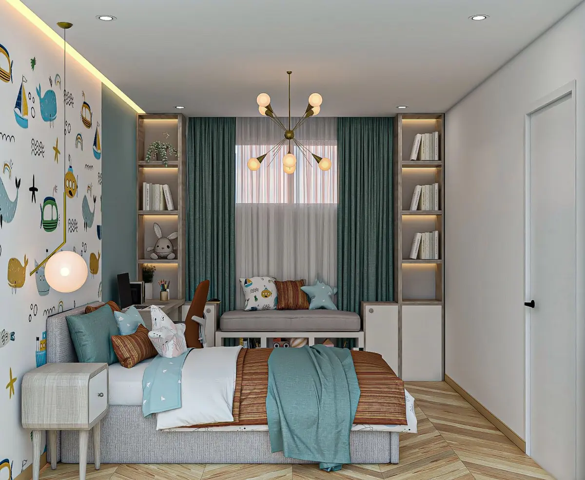 This is a high-quality, detailed 3D model of a modern kids bedroom. The design features a cozy and playful atmosphere with contemporary furniture, soft lighting, and vibrant colors suitable for both boys and girls. Fully textured and UV mapped