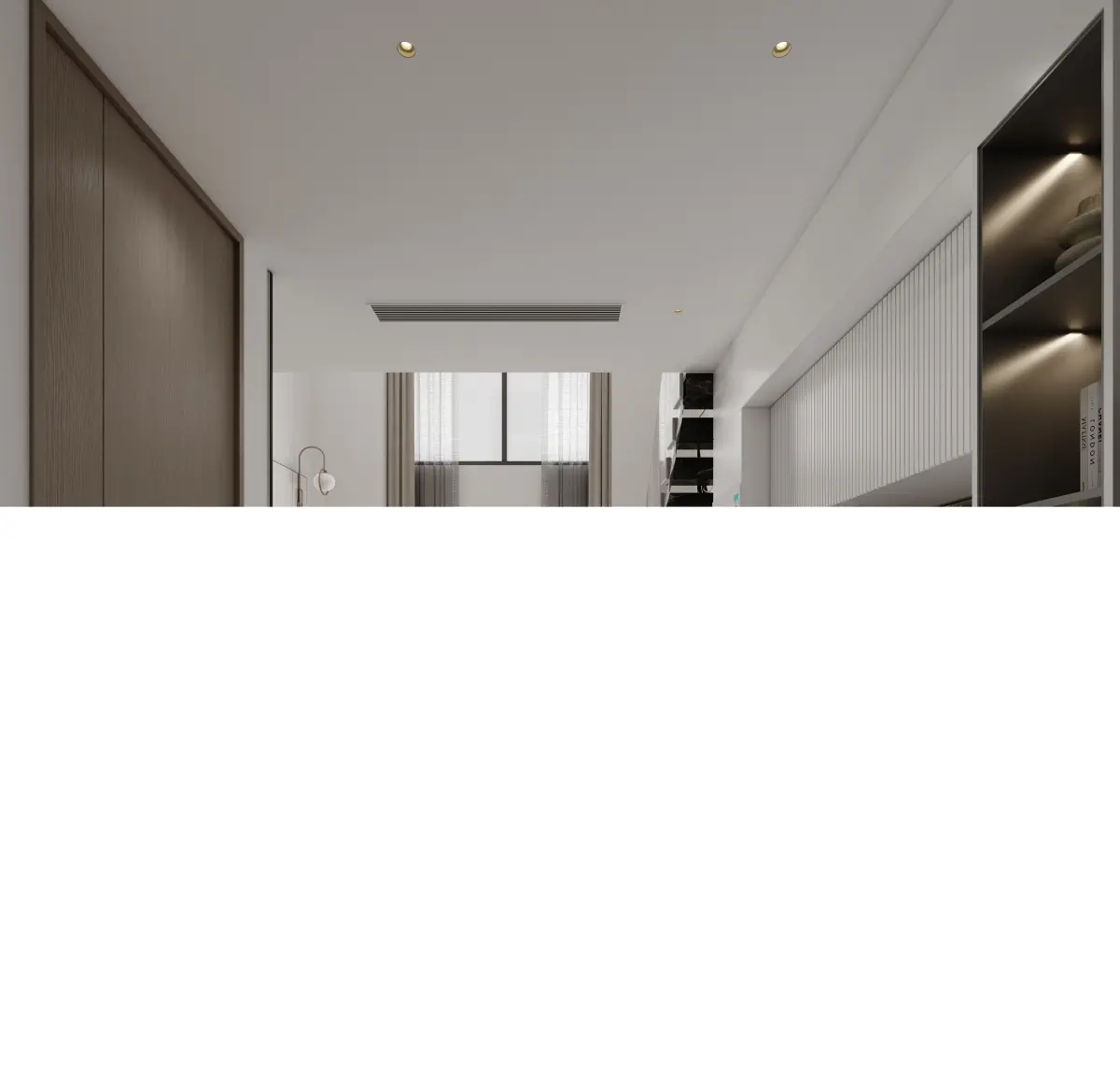 In the upper level and at the back of the scene, there is a living area and a private home office, fully integrated into the architectural layout.