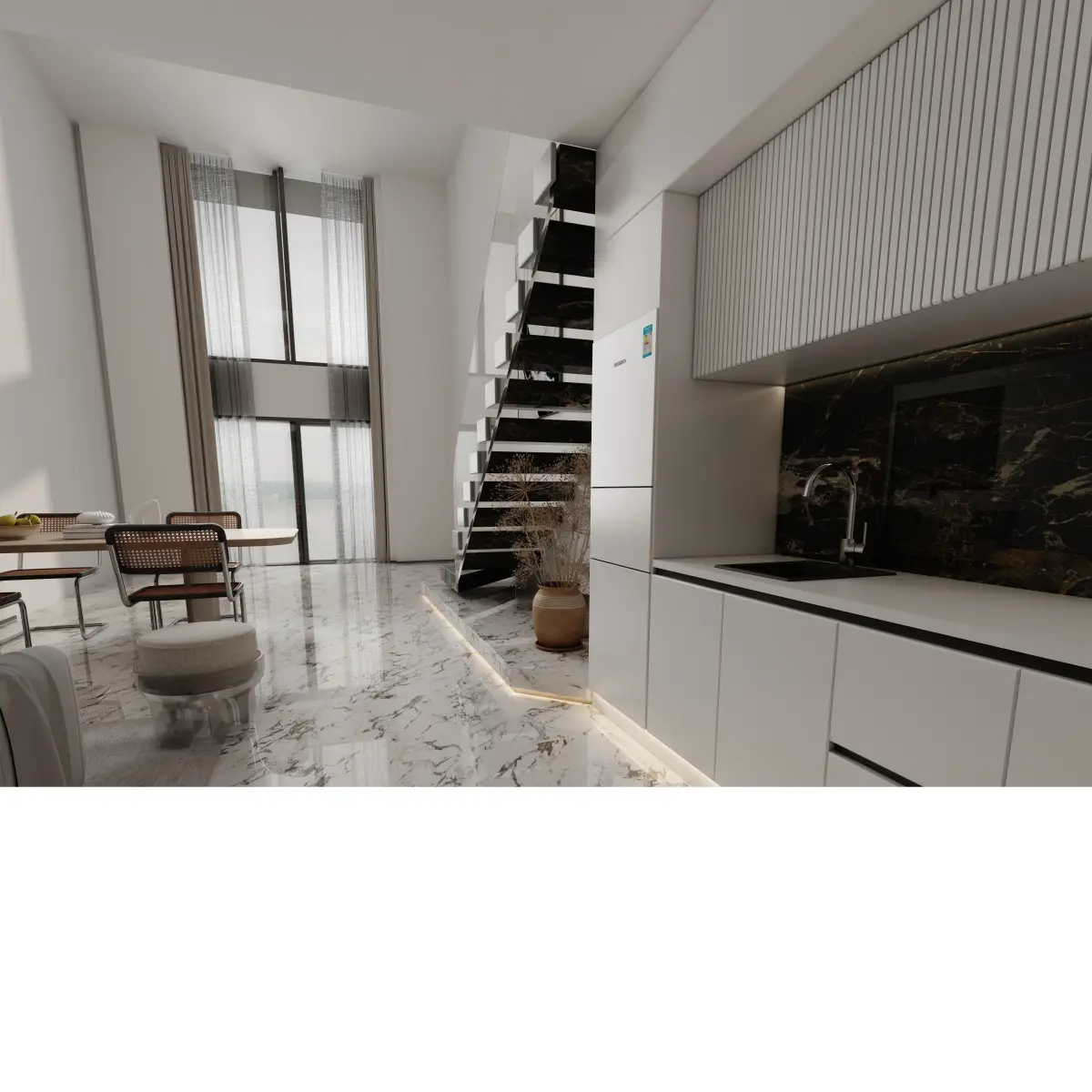 This is a modern kitchen and dining interior 3D scene made in 3ds Max and rendered with Corona Renderer. The design includes a high-ceiling open space with a marble floor, full-height windows, and a white minimalist kitchen with built-in lighting.
