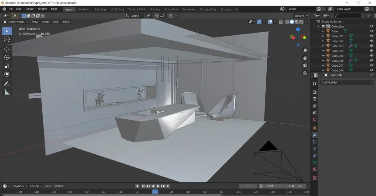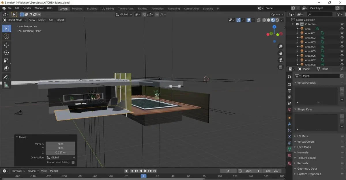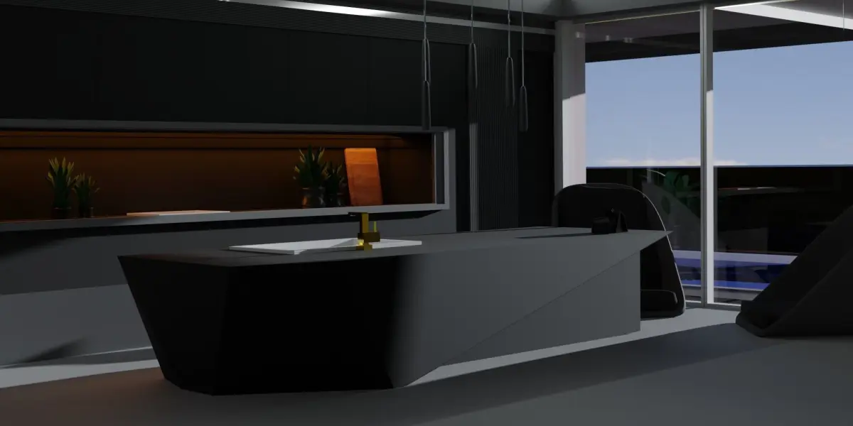 Modeled with incredible detail and realistic lightings. The model is built with a good amount of detail. It can be used as it is or the models can be used in other projects too. The model includes a kitchen island with spotlights and a tap, two chairs, plants, a swimming pool in the back. The lightings are so accurate and taken much care of.