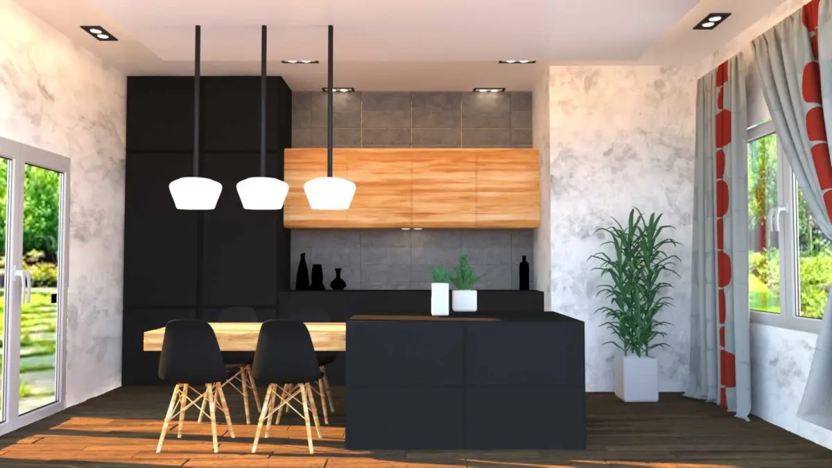 3d kitchen modern and gothic design using wood and black furneture ,with a simple celling decoration , using spot lights and simple design chandelierwidht : 5 meters lenght : 6 meters hight : 3 meters