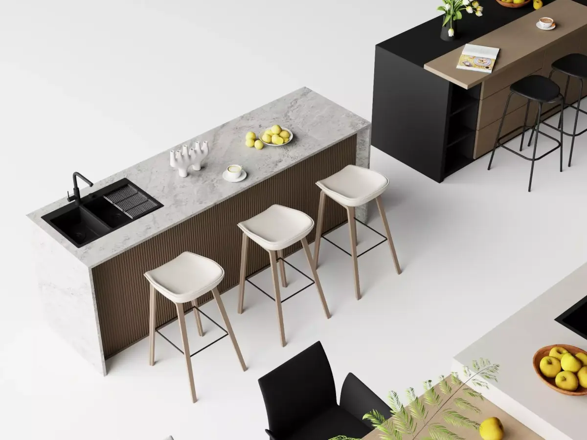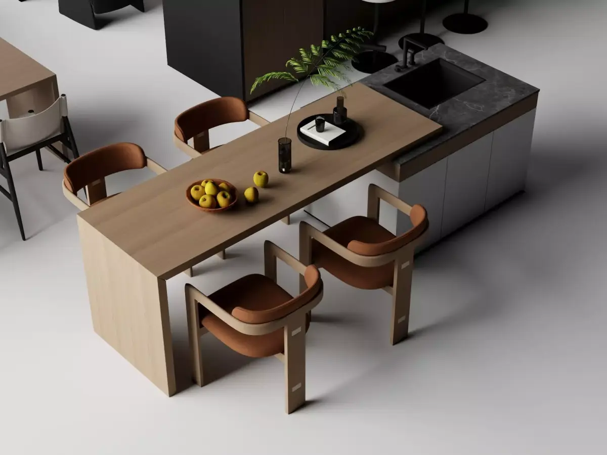 High-quality collection of contemporary kitchen island and dining setups, featuring various minimalist designs with integrated seating, bar stools, pendant lighting placeholders, countertop materials in wood, stone, matte & glossy finishes, plus tableware and plant decorations. Ideal for architectural visualization, interior design renders, real estate marketing, game environments, furniture catalogs, and product showcases. Clean topology, realistic proportions, PBR-ready materials.