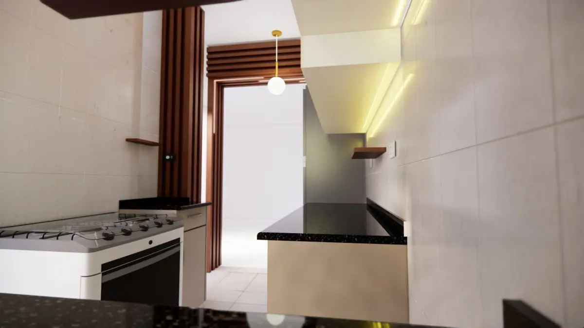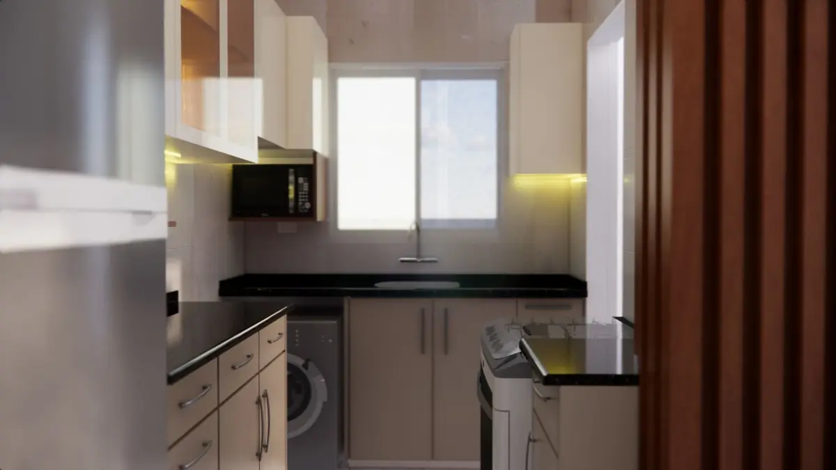 3d sketchup Kitchen based on my real work on a Kitchen remodeling Project, Enscape RendererModern Kitchen with black peppled Granite fully furnished, washing machine, Refrigerator & Gas cook.