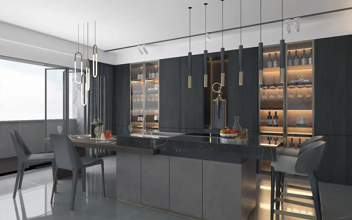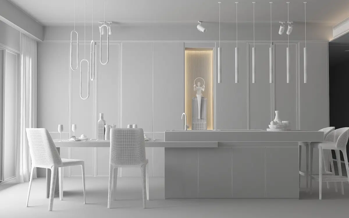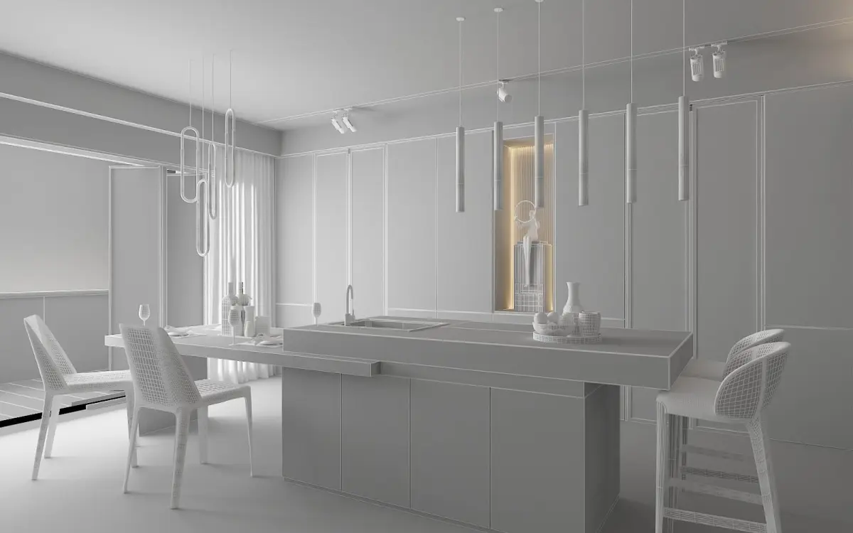 Modern Kitchen with island Units used: millimeter. All preview images are rendered with V-Ray. JPG textures come in the separate archive. All objects are UV mapped. All materials are named properly.